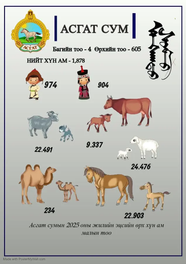 📌Асгат сумын 2025 оны жилийн эцсийн өрх, хүн ам, мал тооллогын дүнгээр: Нийт хүн ам: 1,878 Нийт малын тоо:79441 📌2024 оны жилийн эцэстэй харьцуулахад малын тоо толгой 19%-иар өссөн үзүүлэлттэй байна.