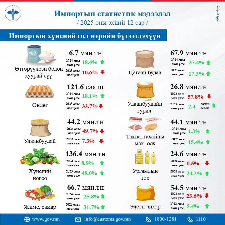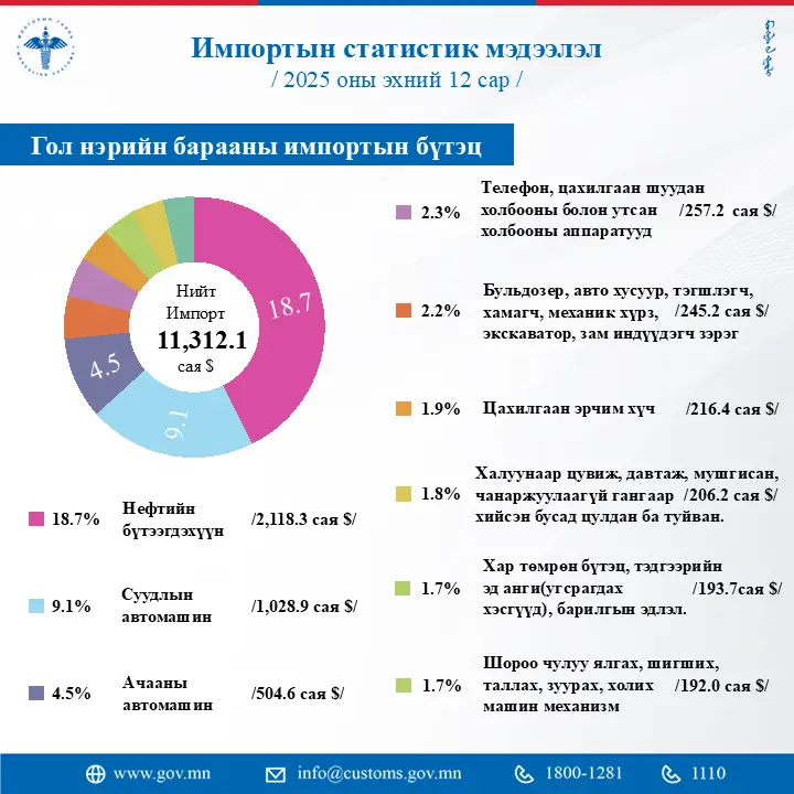 Импортоор нийт 11314.7 сая ам.долларын бараа, түүхий эд оруулсан нь 2024 оны мөн үетэй харьцуулахад 302.6 сая ам.доллараар буюу 2.6 хувиар буурсан байна.