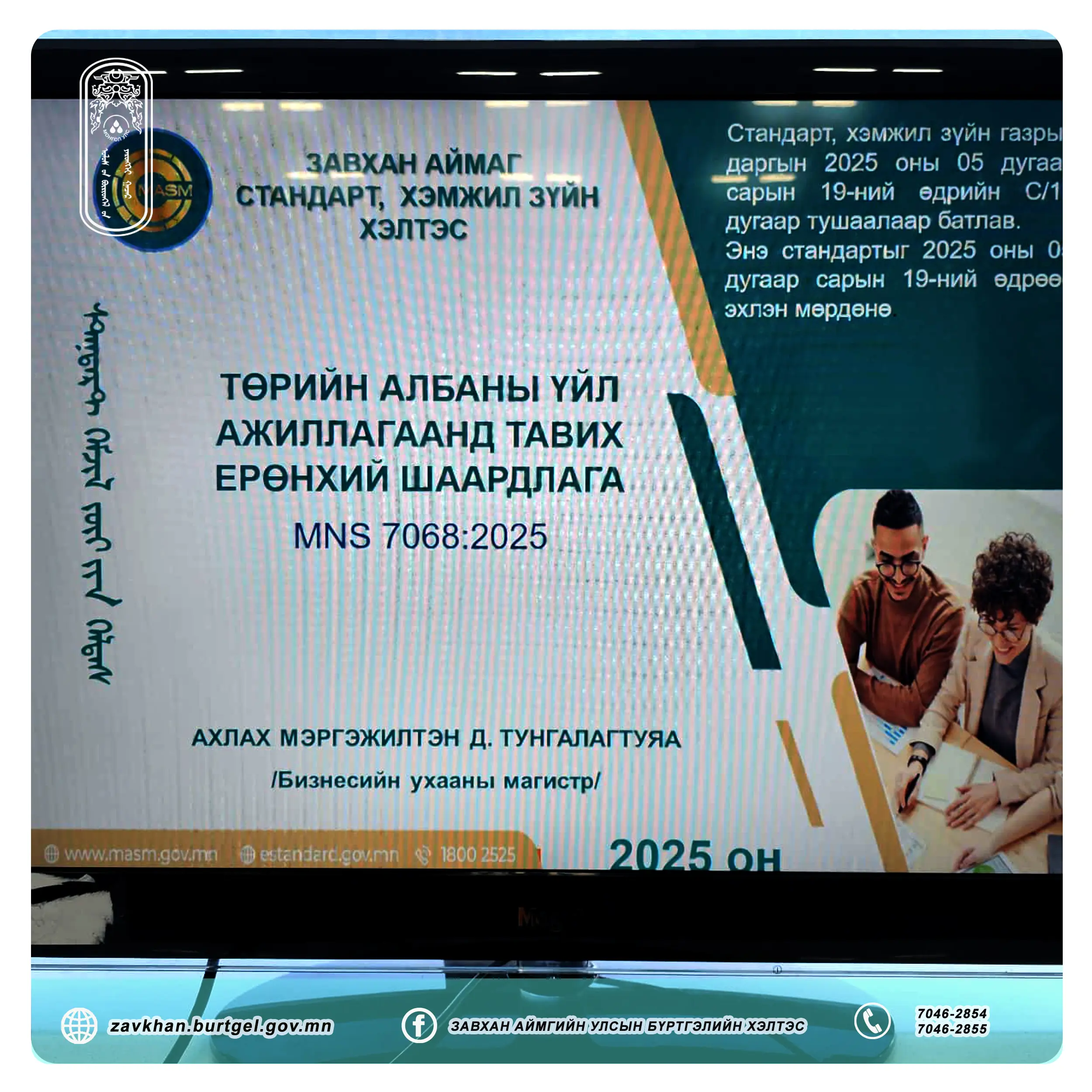 “Стандартаа хэрэгжүүлэе” уриан дор Баримт бичгийн стандарт MNS5041-1:2021, MNS5041-2:2021, MNS5041-3:2021, Төрийн байгууллагын үйл ажиллагаанд тавих шаардлага MNS7068:2025 стандартын талаар сургалт, мэдээлэлийг аймгийн Стандарт, хэмжил зүйн хэлтсийн Ахлах мэргэжилтэн Д. Тунгалагтуяа хийж, стандартын хэрэгжилтийг сайжруулах талаар зөвлөгөө өглөө.