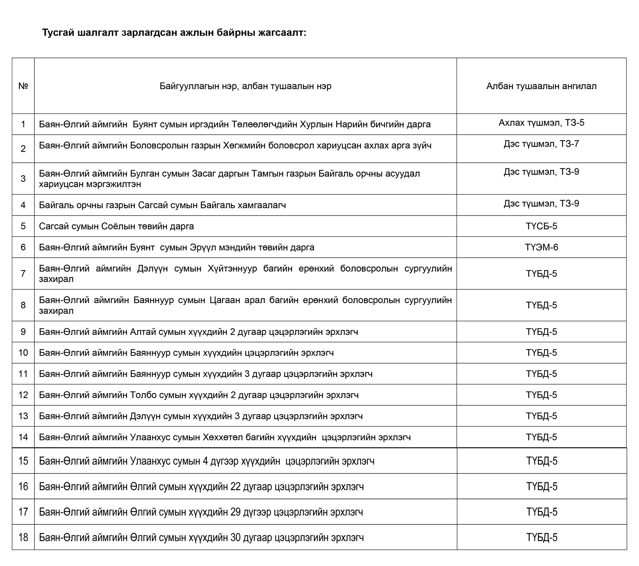 Тусгай шалгалт зарлагдсан ажлын байрны жагсаалт:
