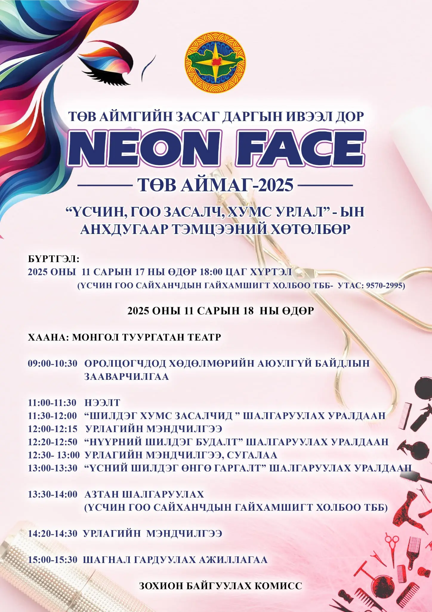 Аймгийн Засаг даргын ивээл дор "NEON FACE" үсчин, гоо засалч, хумс урлалын анхдугаар тэмцээнийг зохион байгуулах гэж байна.