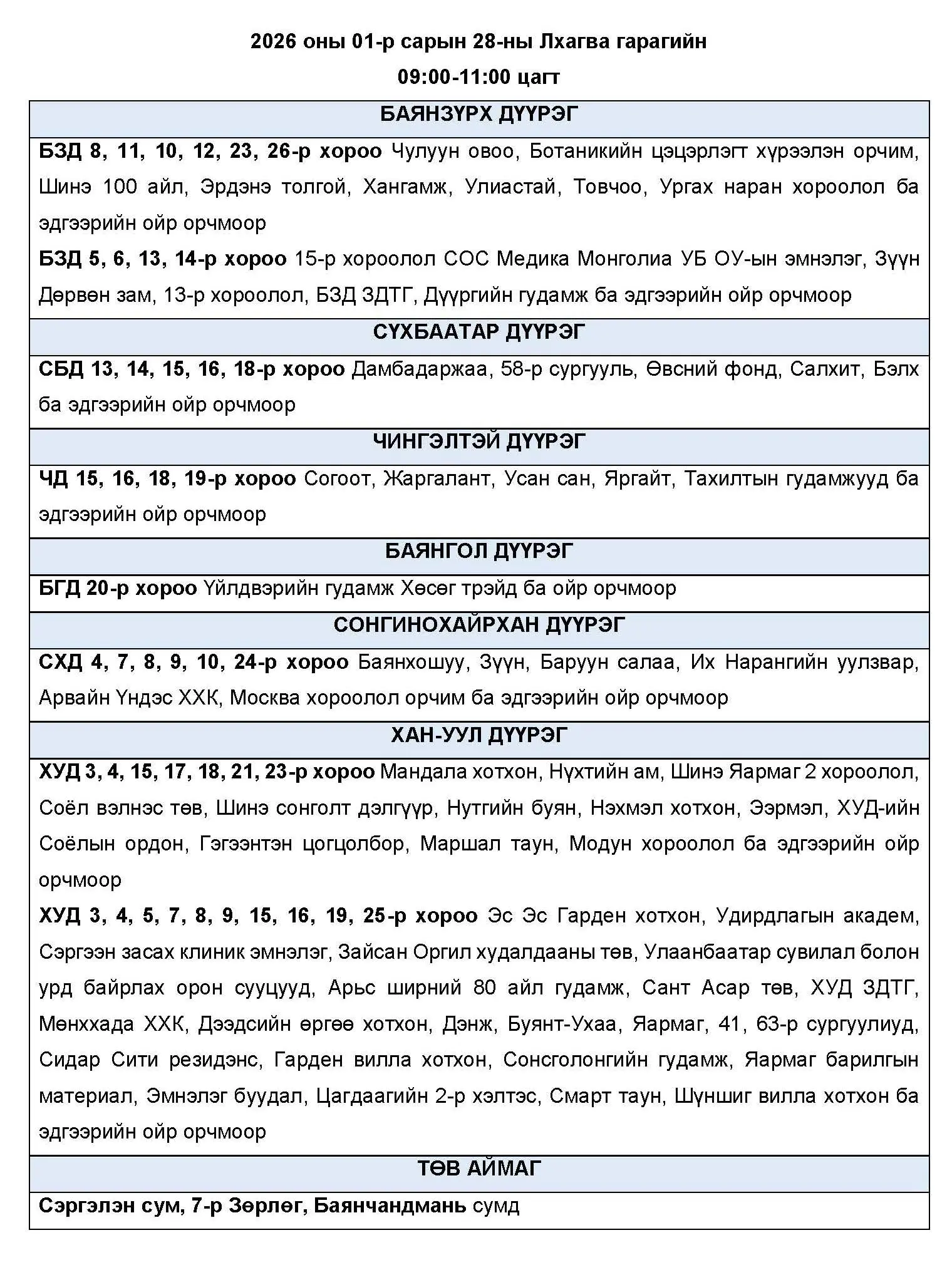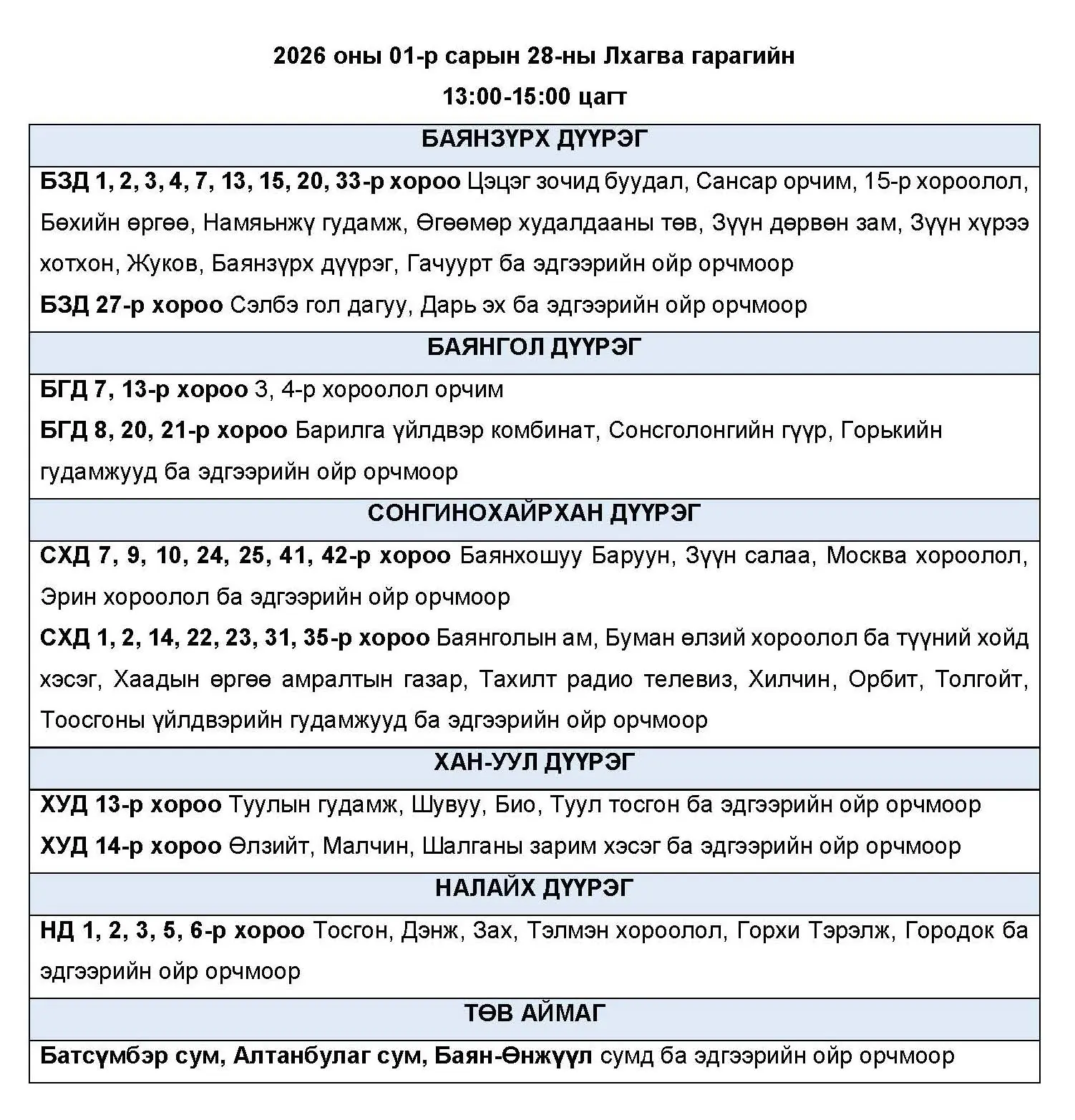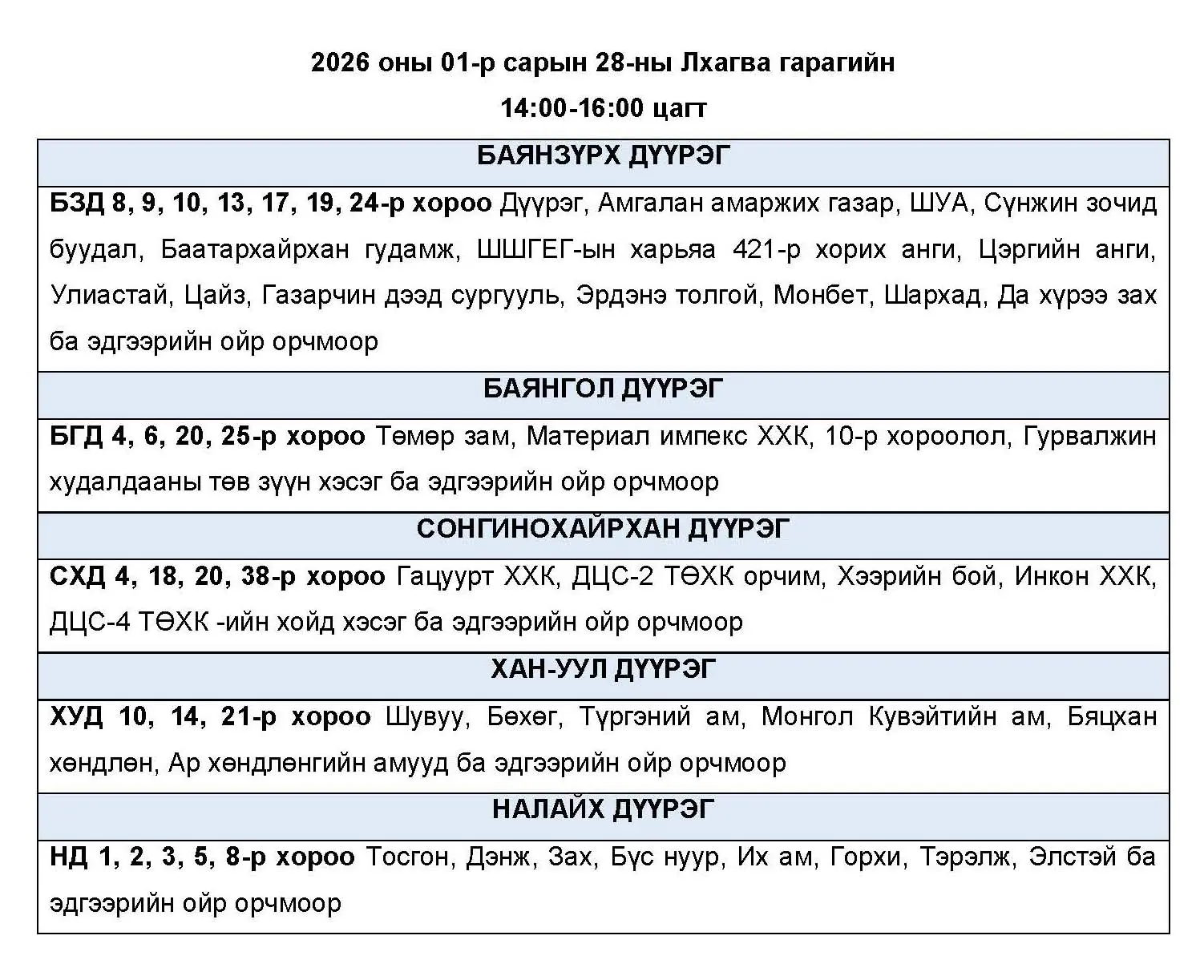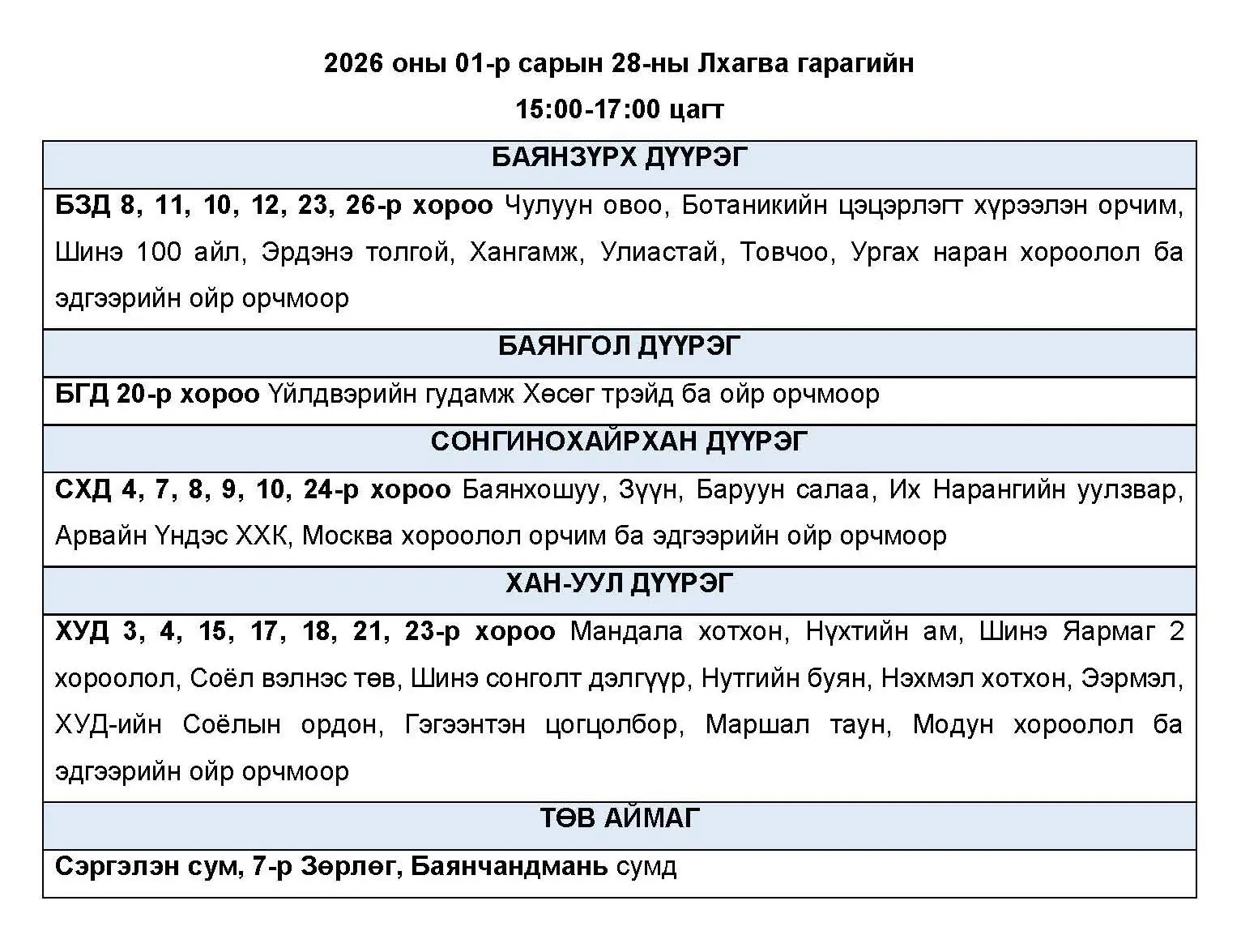 2026 оны 01-р сарын 28-ны Лхагва гарагт хийх “ЦАХИЛГААНЫ ХЯЗГААРЛАЛТЫН ХУВААРЬ