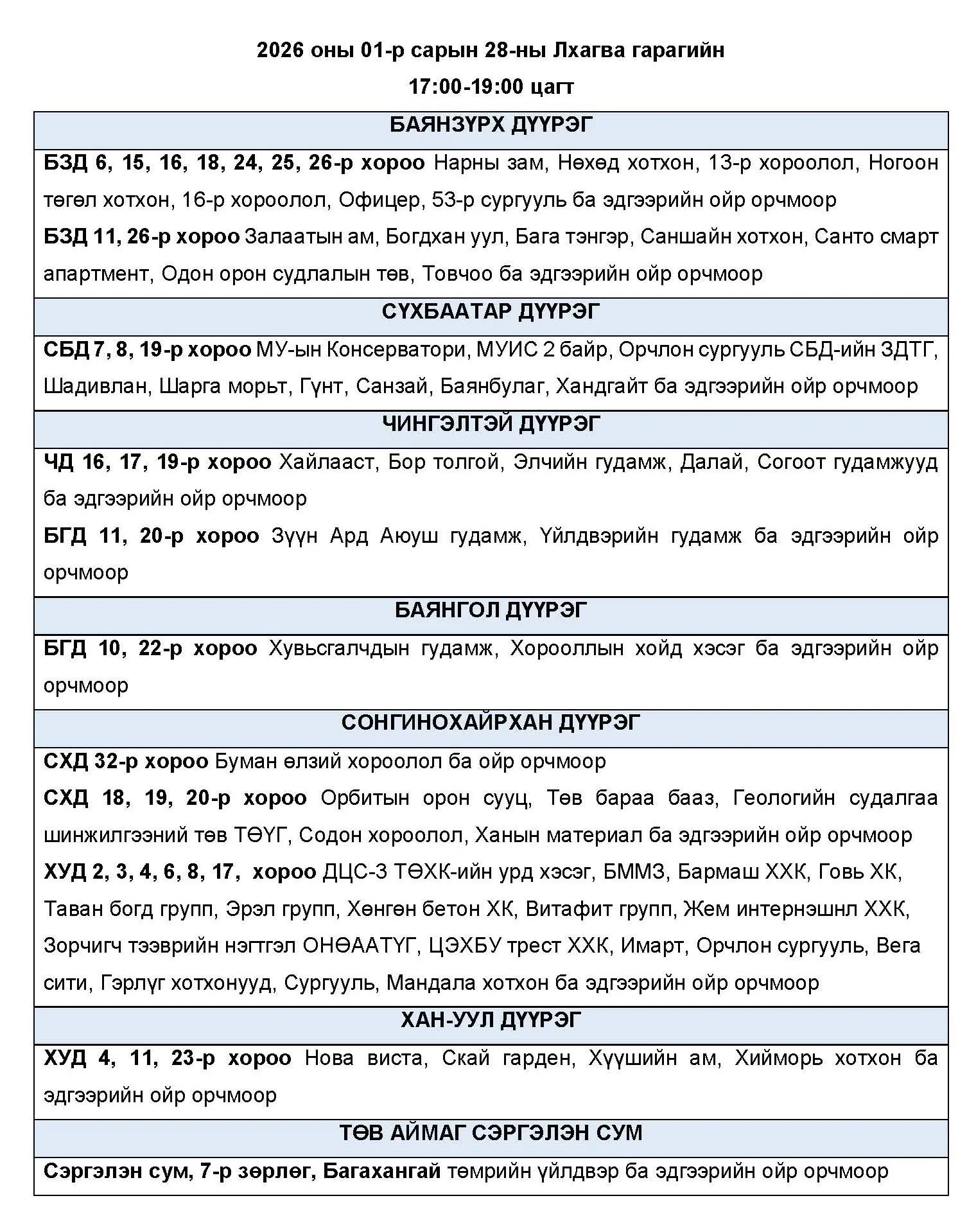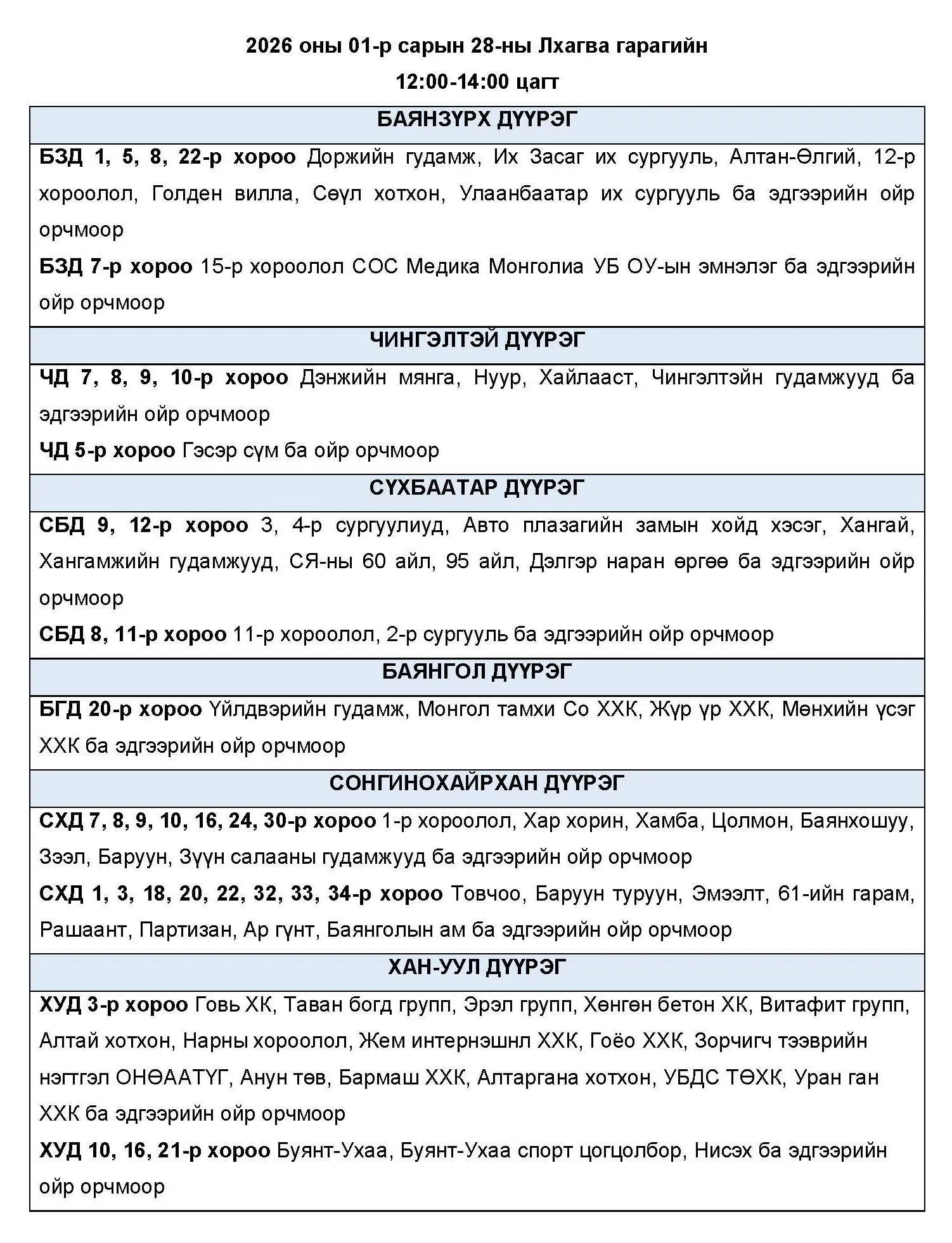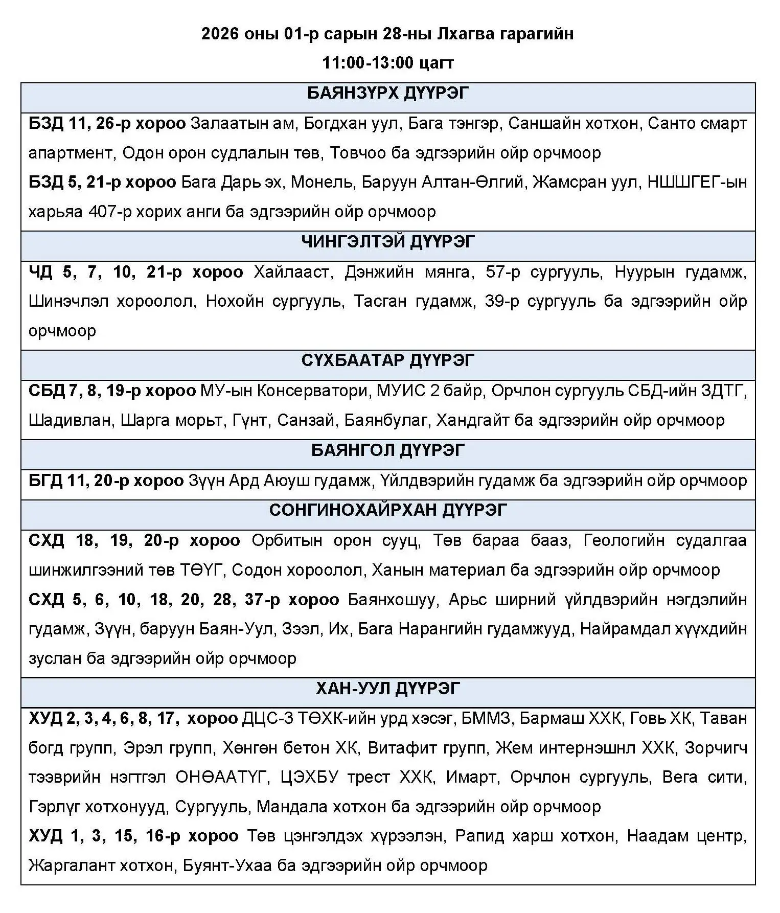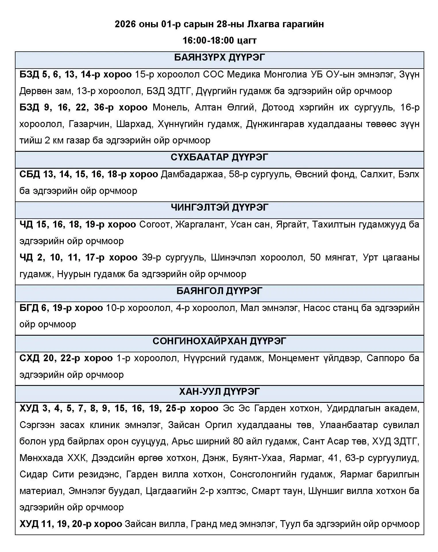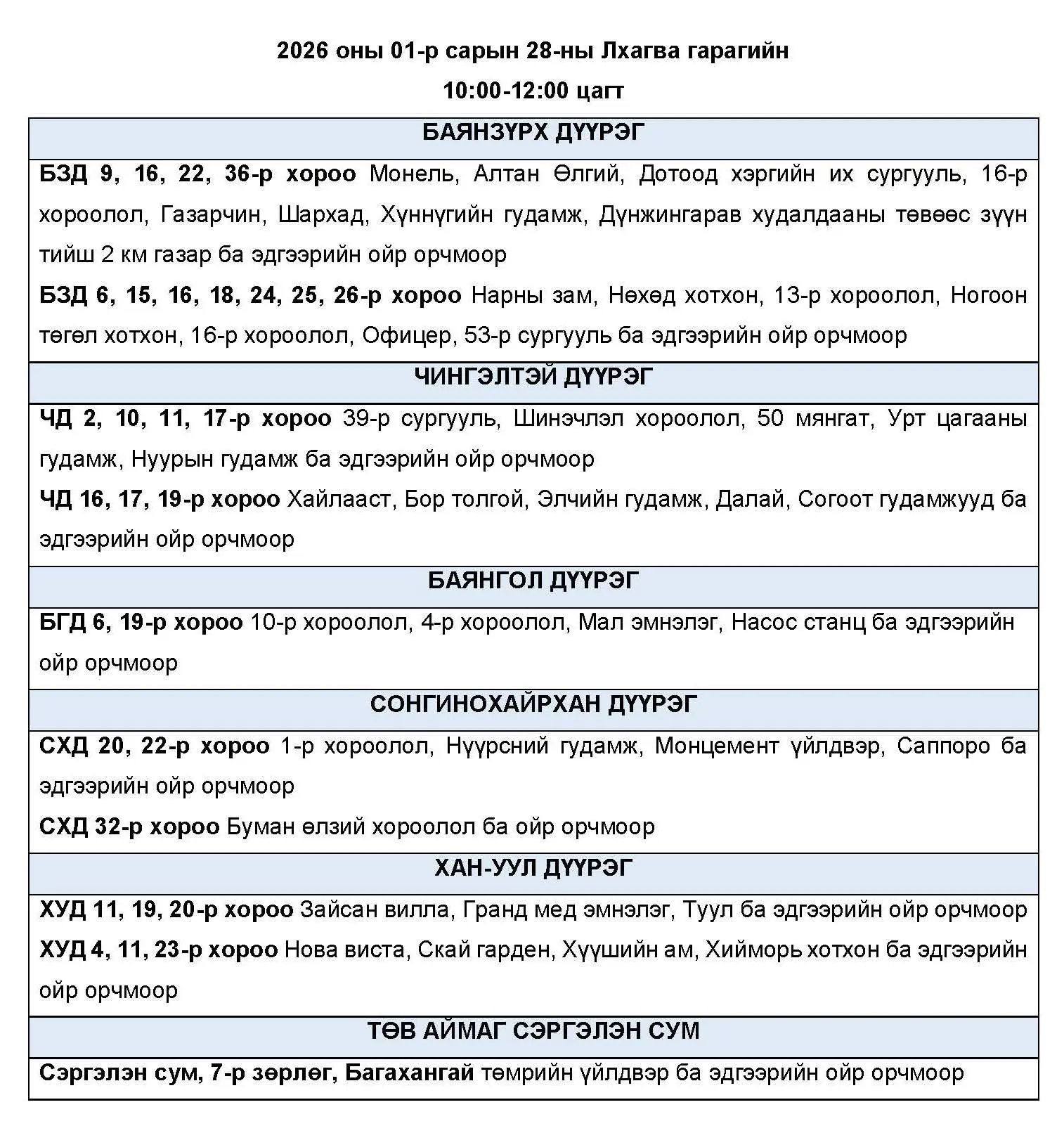 2026 оны 01-р сарын 28-ны Лхагва гарагт хийх “ЦАХИЛГААНЫ ХЯЗГААРЛАЛТЫН ХУВААРЬ
