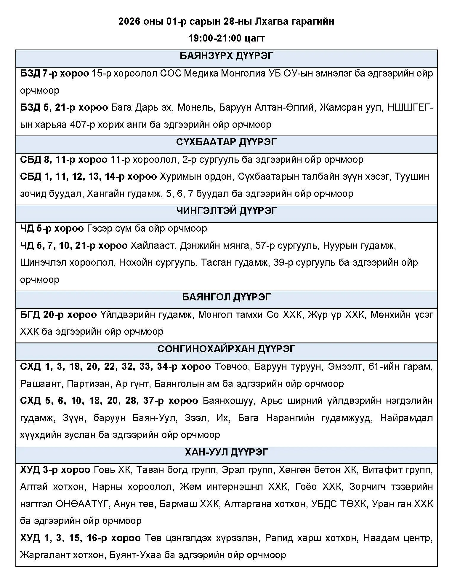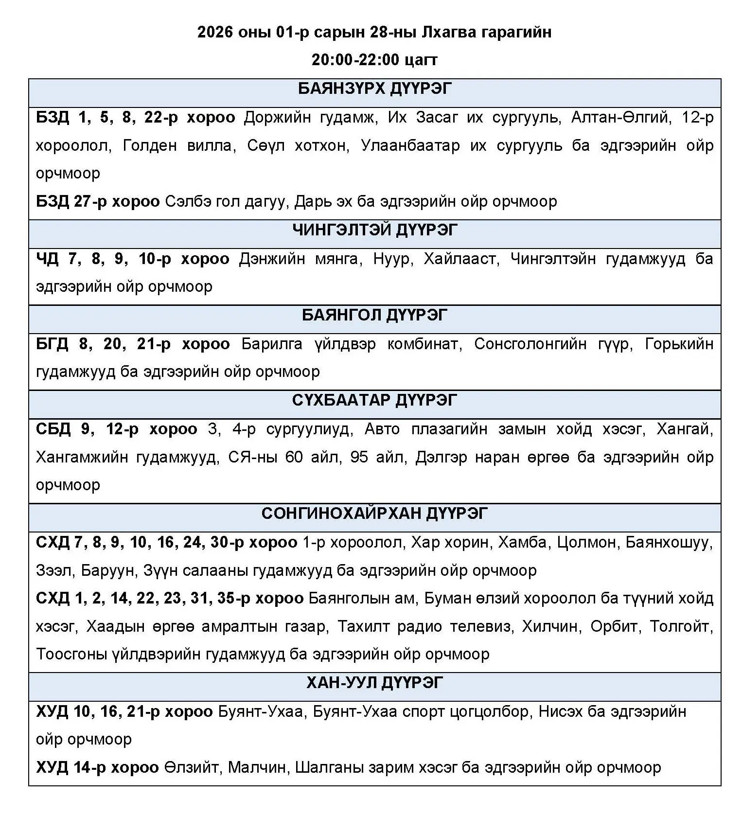 Эрчим хүчний системд аваарын горим үүсэхээс сэргийлэн нэгдсэн сүлжээнд холбогддог тодорхой байршлуудад цахилгаан эрчим хүчний төлөвлөсөн хэрэглээг “Диспетчерийн үндэсний төв” ТӨХХК-ийн шийдвэрээр хуваарийн дагуу 2 цагийн хугацаатайгаар хязгаарлах арга хэмжээ авч байна.
