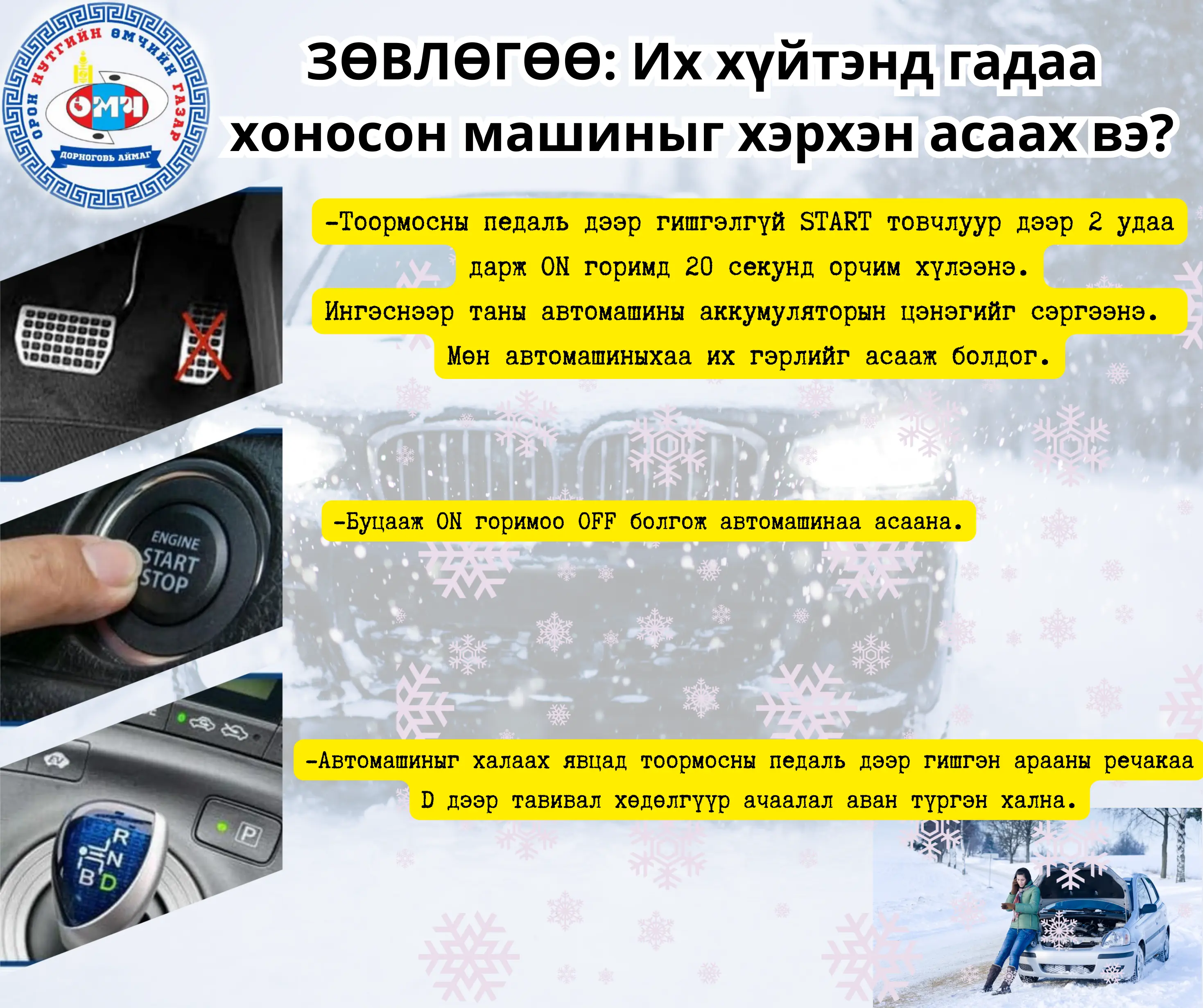 Иймд эрс хүйтэнд гадаа хоносон автомашин асахгүй, суух үзэгдэл их гарч байгаа тул дараах зөвлөмжийг хүргэж байна. 👇