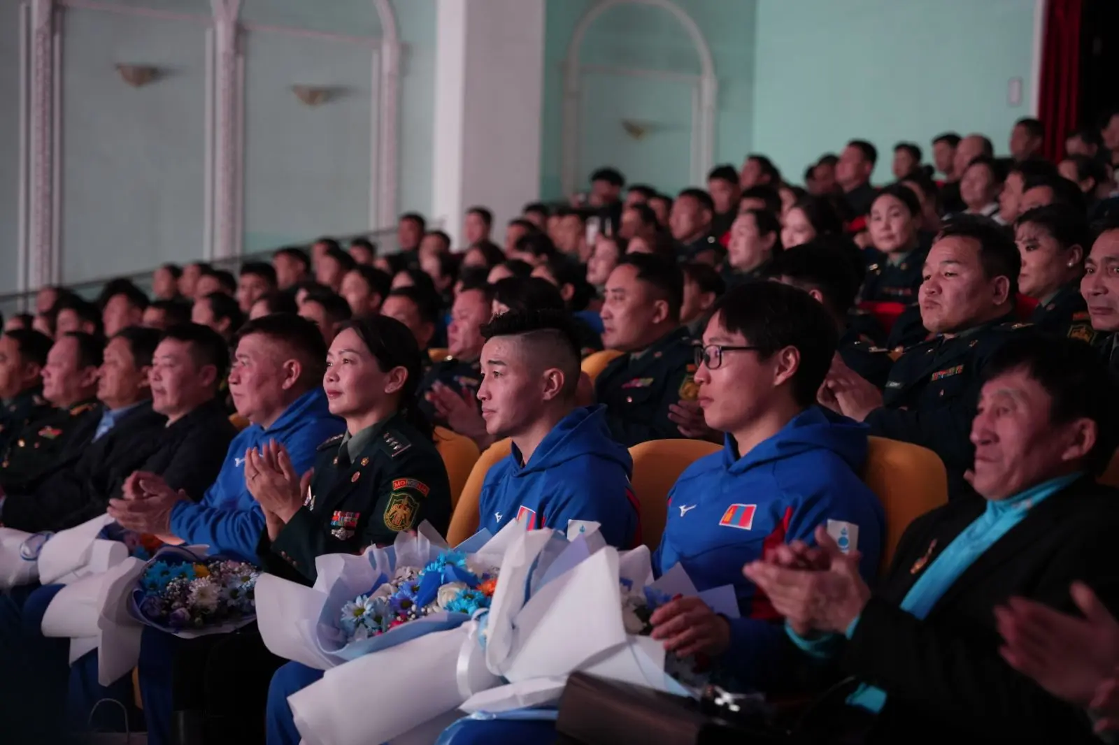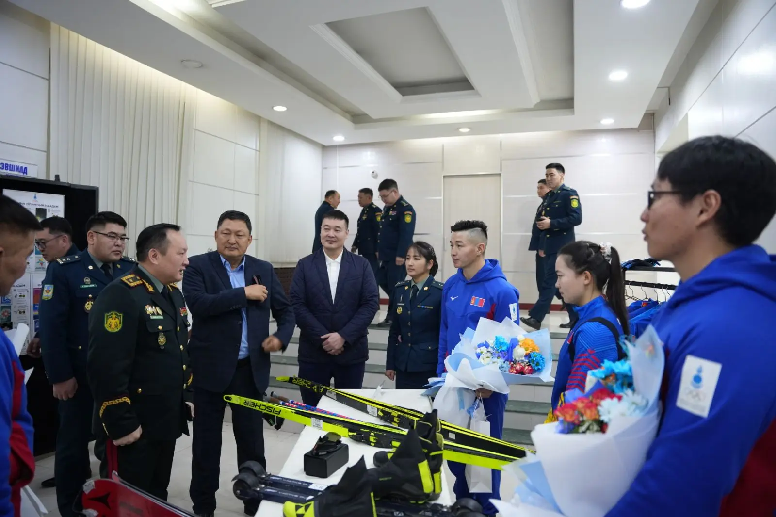 Харин А.Ариунбат: -“Би уулын цанын шигшээ багийн тамирчин. Таван настайгаасаа эхлэн уулын цанын спортоор хичээллэж, сүүлийн 4–5 жилд мэргэжлийн түвшинд бэлтгэл сургуулилтаа хийж байна. Уулын цанын спорт нь гараанаас барианд хүртэл байгальтайгаа нягт уялдаатай байх асар их мэдрэмж шаарддаг онцлогтой. Уулын уруу цасан дээгүүр цагт 70-80 километрийн хурдтай, ямар ч бэхэлгээгүйгээр уруудах нь энэ спортыг онцгой болгодог. Гэхдээ ганцхан бэртэл авбал маш хүнд гэмтэл авах өндөр эрсдэлтэй тул гараанд гарах бүртээ сэтгэлзүйн маш өндөр бэлтгэлтэй байх шаардлагатай болдог. Өнөөдөр биднийг хүлээж авна гэж сонссон ч ийм сайхан, хүндэтгэлтэйгээр угтана гэж огт төсөөлөөгүй. Би саяхан хилчин тамирчин болсон. Цэргийн хүндэтгэлийн арга хэмжээнд анх удаа оролцож байна. Соёлын төвийн үүдээр ороход үлгэр жишээ үлээвэр найрал хөгжим эгшиглэж, хилчид маань бүгд босож хүндэтгэл үзүүлэн алга ташаад зогсож байсан тэр мөчийг би хэзээ ч мартахгүй” хэмээв. Ийнхүү Монгол Улсаа төлөөлөн өвлийн олимпын наадамд оролцох хилчин тамирчдаа хүлээн авч, урам зориг хайрласан энэ өдөр итгэл, бахархлын уур амьсгалаар дүүрэн байлаа. Дөрвөн жилд нэг тохиох их наадамд эх орныхоо нэрийг өндөрт өргөхөөр бэлтгэж буй тэдний зам цас шиг цэвэр, зорилго нь тод байх болтугай.