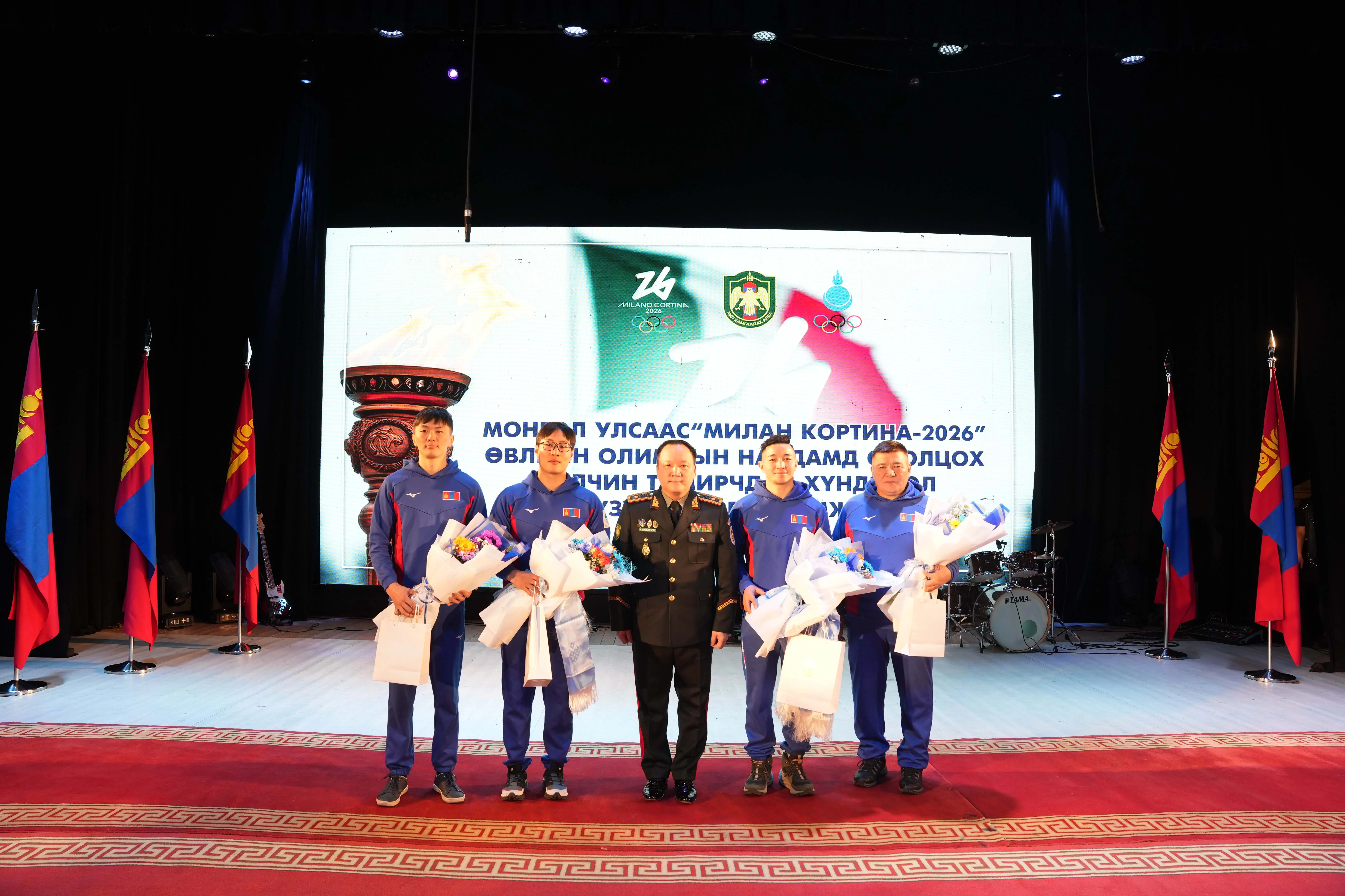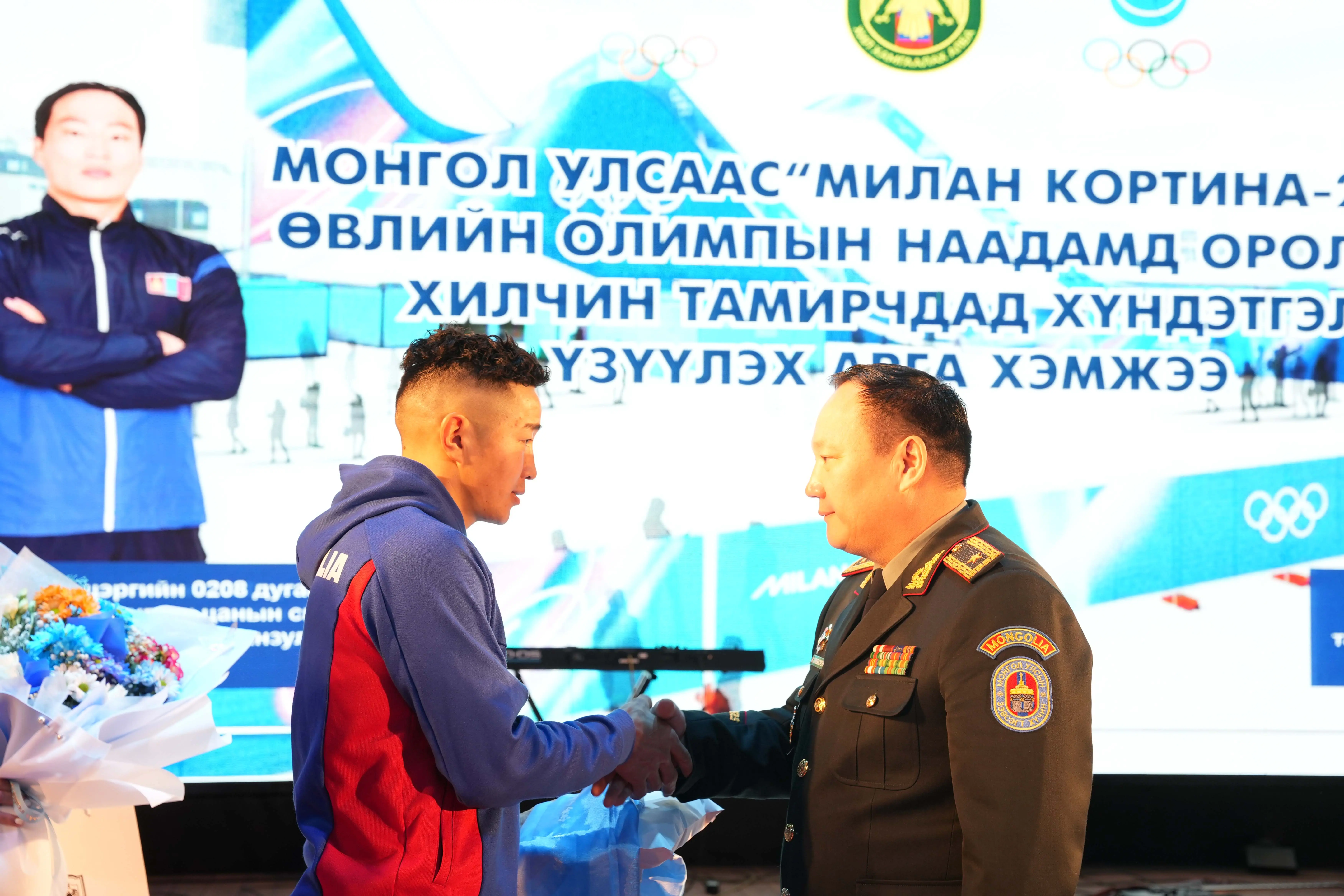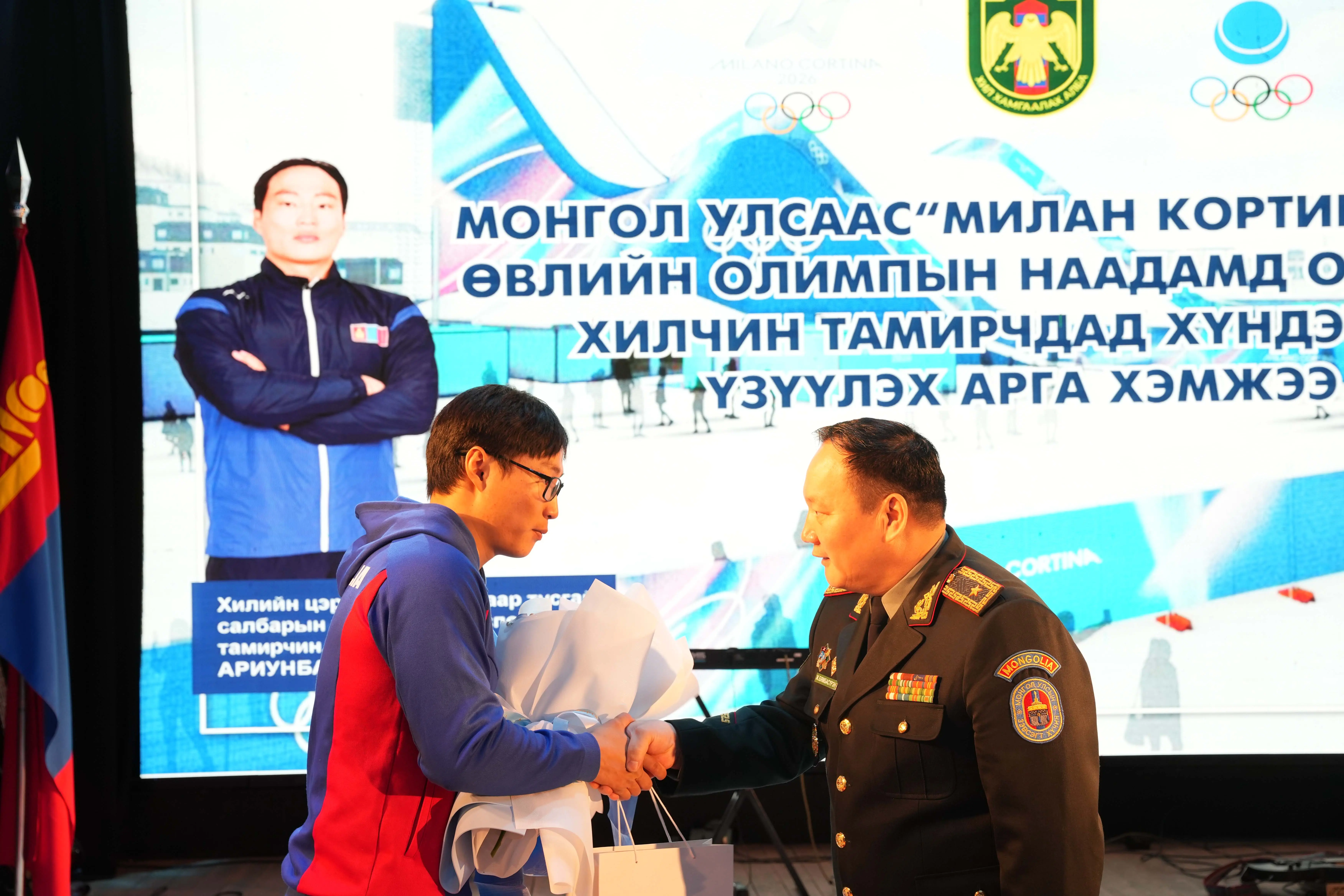 Монгол Улсаас 25 дахь удаагийн өвлийн олимпод оролцох хилчин тамирчдыг хүлээн авч, хүндэтгэл үзүүлэх ёслолын ажиллагаа энэ сарын 09-ны өдөр Хил хамгаалах ерөнхий газарт болов. Энэ үеэр Монголын цанын холбооны ерөнхийлөгч Д.Хишигжаргал, ерөнхий нарийн бичгийн дарга П.Энхтайван, гүйлтийн цанын шигшээ багийн дасгалжуулагч Д.Баттулга, уулын цанын шигшээ багийн дасгалжуулагч С.Тэмүүлэн, ахлах ахлагч Б.Ачбадрах, А.Ариунбат, “Хилчин” олимп, биеийн тамир спортын холбооны төлөөлөн удирдах зөвлөлийн дарга, бэлтгэл хурандаа Г.Хулан нар хүрэлцэн ирэв. Тэднийг соёлын төвд орж ирэхээс эхлээд танхим дүүрэн хилчид хүндэтгэн алга ташиж, Үлгэр жишээ үлээвэр найрал хөгжимд марш эгшиглэн ёслол төгөлдөр угтаж авсан юм. Ирэх хоёрдугаар сарын 06-наас 22-ны өдрүүдэд зохион байгуулагдах “Милан Кортина 2026” өвлийн олимпын наадамд оролцох хилчин тамирчид болон дасгалжуулагчдадаа ХХЕГ-ын дарга, Хилийн цэргийн командлагч, бригадын генерал Ж.Бямбасүрэн гарын бэлэг, дурсгалын зүйл гардуулж, нийт хилчдээ төлөөлөн итгэл хүлээлгэж буйгаа илэрхийлэв.