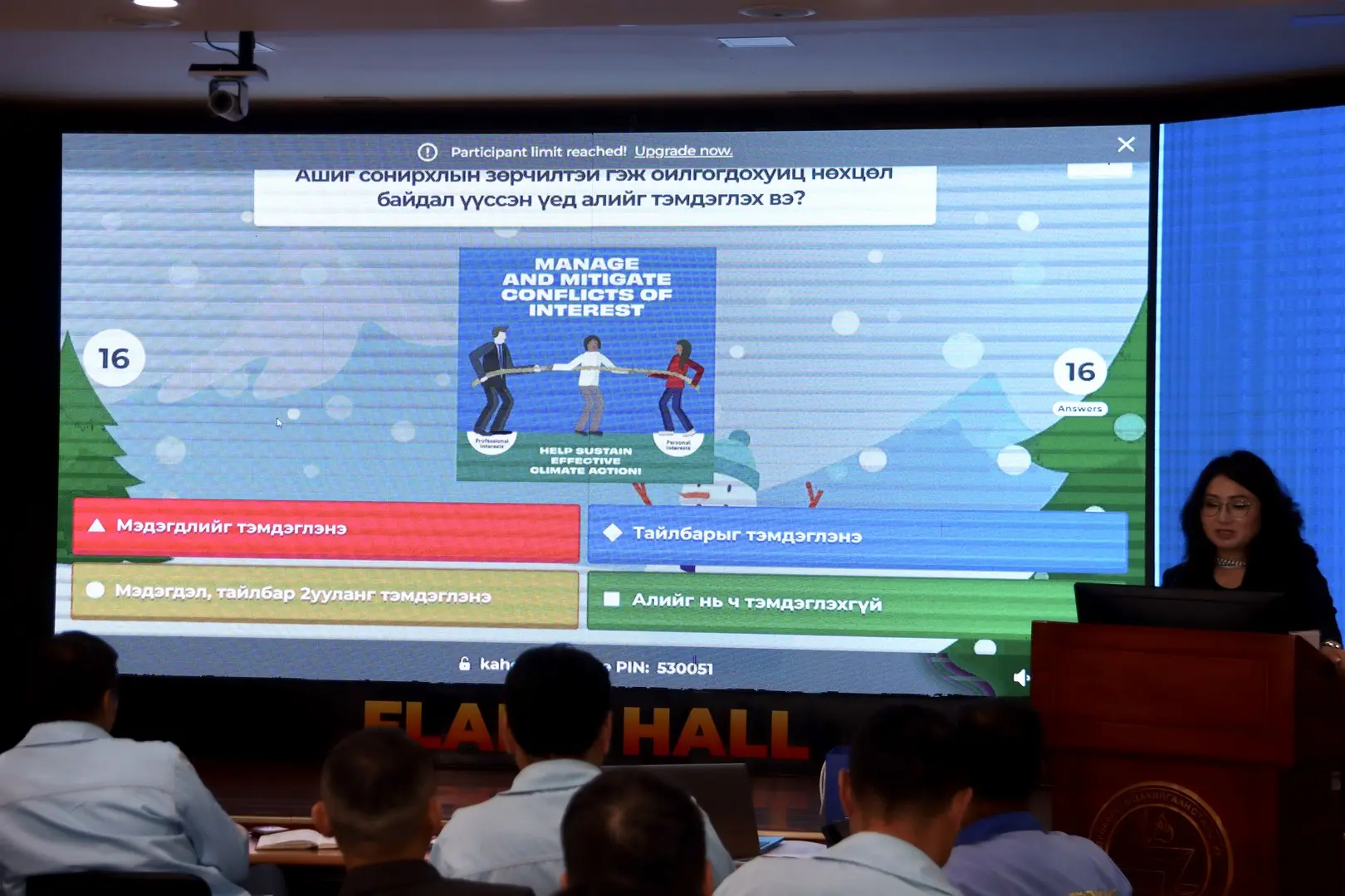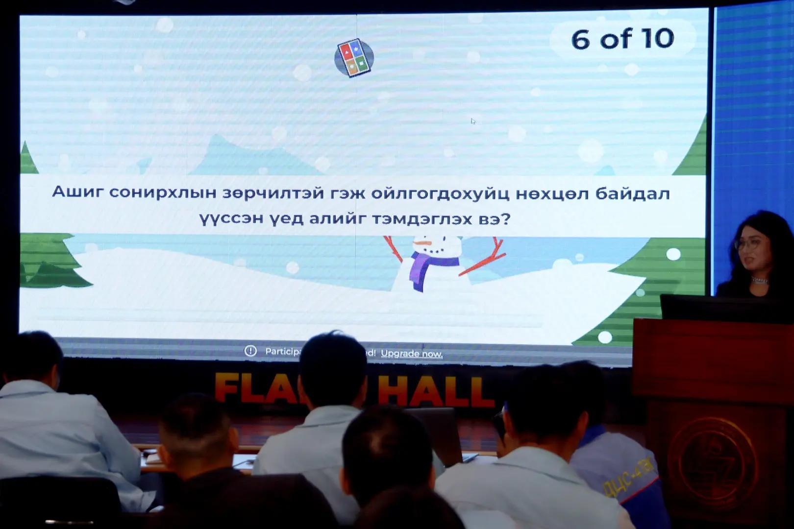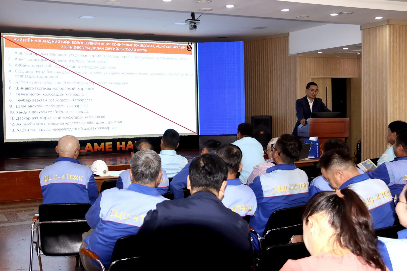 Монгол Улсын Ерөнхий сайдын 2025.06.18-ны өдрийн 01, 2025. 07.25-ны өдрийн 04 дүгээр албан даалгаврын хэрэгжилтийг хангах арга хэмжээний төлөвлөгөөний 2.4-т тусгагдсан “Төрийн албан хаагчийн ёс зүйн тухай хууль, Авлигын эсрэг хууль, Нийтийн албанд нийтийн болон хувийн ашиг сонирхлын зөрчлөөс урьдчилан сэргийлэх тухай хуулийн талаарх холбогдох сургалт, соён гэгээрүүлэх ажлыг зохион байгуулах” чиглэлийн хүрээнд компанийн эрх бүхий албан тушаалтнууд, бүх нэгжийн дарга, ахлахууд, худалдан авах ажиллагаанд оролцдог А3-ын эрхтэй ИТА-ууд, гэрээ контракт хийдэг, бараа материал хүлээн авдаг, хянадаг, хадгалдаг ажилтан, албан тушаалтнууд, хараат бус гишүүдийг хамруулан АТГ-ын УССГХ-ийн ахлах ажилтан, ахлах комиссар Б.Тэрбиш, УССГХ-ийн ажилтан, комиссар У.Номин-Эрдэнэ нар Төрийн албаны ил тод нээлттэй байдал, холбогдох хуулийн хэрэгжилт, шинэчлэлт, бодит кейсээр жишээ аван ойлгомжтой, сонирхолтой, мэргэжлийн ойлголтыг өгсөн сургалтыг АТГ-ын Урьдчилан сэргийлэх, соён гэгээрүүлэх хэлтсээс баталсан хөтөлбөрийн дагуу зохион байгуулав. Сургалтын төгсгөлд сургалтаас олж авсан мэдлэгээ баталгаажуулах хөгжөөнт тоглоомын арга нь сонирхолтой байсан хийгээд үр дүн нь оролцогчдын нүдэн дээр ил тод нээлттэй байсан нь сургалтын мөн чанар, ач холбогдлыг илтгэж байв. Цахилгаан цехийн ашиглалтын инженер С.Энхманлай, ТЭЗХ-ийн тоноглолын төсөв хариуцсан мэргэжилтэн Д.Одноо, Хяналтын хэлтсийн ХАБЭА хяналтын инженер Э.Гүржав нар хамгийн өндөр оноо аван мэдлэгээ баталгаажуулсан оролцогч болж, сургалтад оролцогчдоо манлайлав.