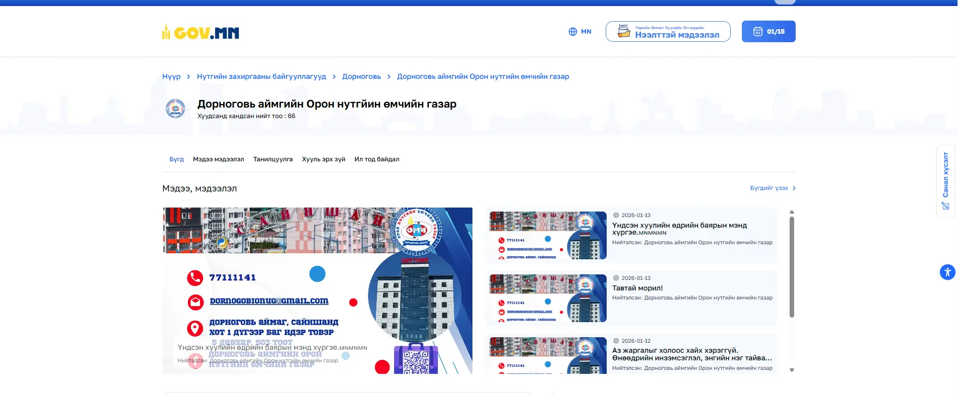 Манай байгууллагын “Тогтвортой бодлого – Тасралтгүй хөгжил” зорилтын хүрээнд хэрэгжиж буй “Цахим Дорноговь” хөтөлбөрийн дагуу цахим шилжилт, ил тод байдлыг хангах зорилгоор иргэдэд нээлттэй мэдээлэл хүргэх цахим сайтыг ажиллуулж байна.