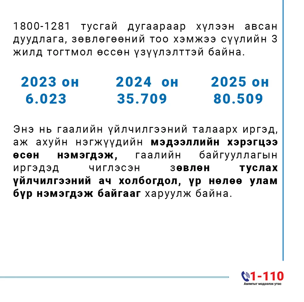 Гаалийн байгууллага өнгөрсөн онд 1800-1281 дугаараар 80,509 дуудлага хүлээн авч, мэдээлэл, зөвлөгөө өгч ажиллажээ