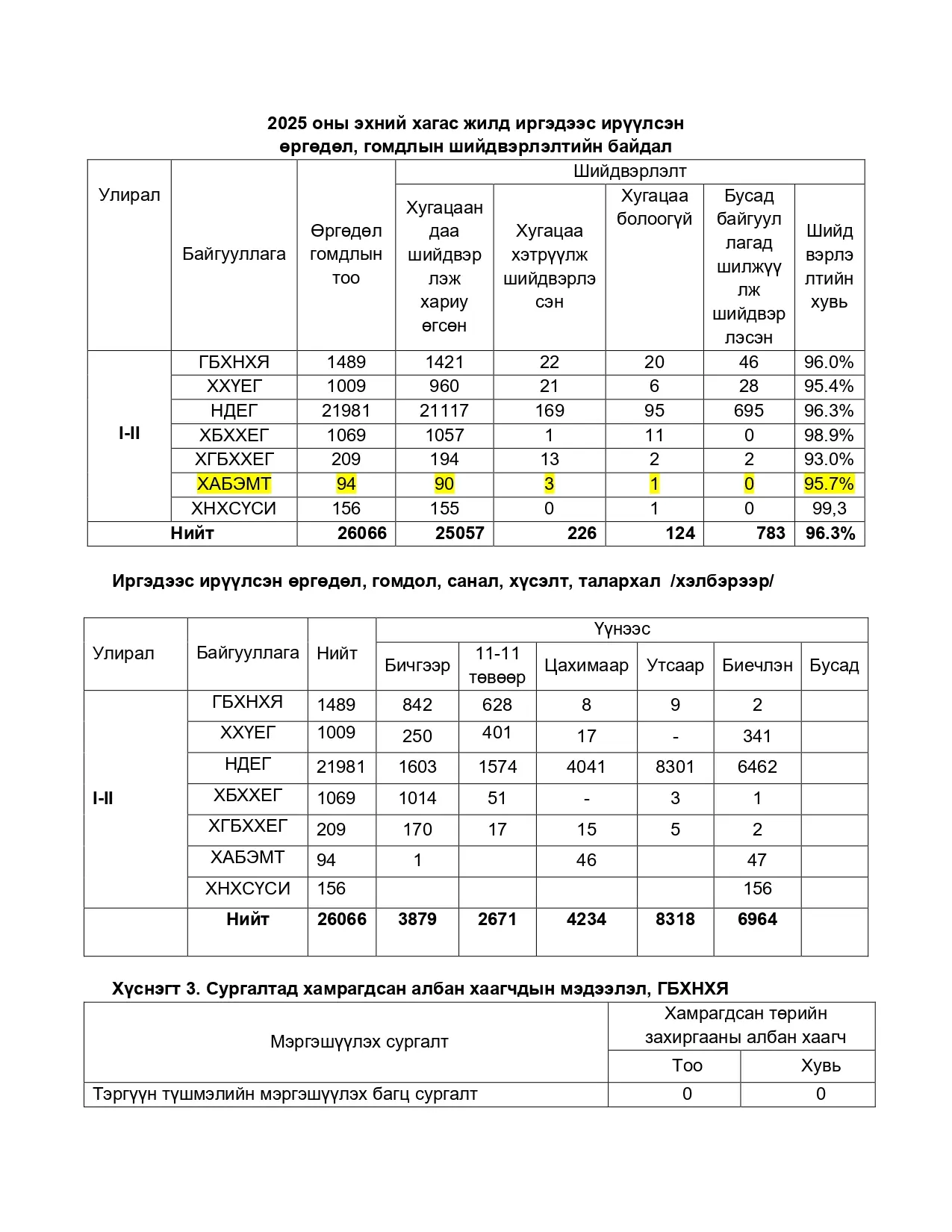 2025 оны эхний хагас жилд иргэдээс ирүүлсэн өргөдөл, гомдол шийдвэрлэлтийн байдал