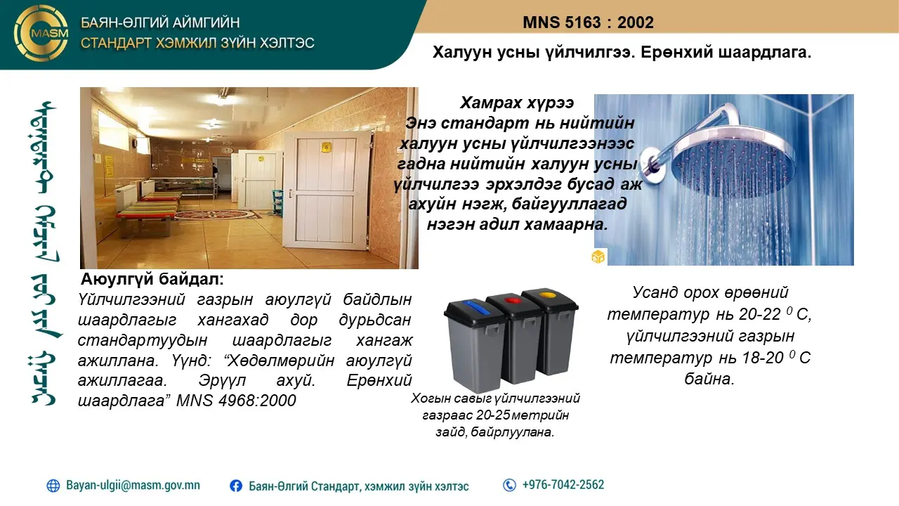 Халуун усны үйлчилгээ. Ерөнхий шаардлага. MNS 5163:2002 https://estandard.gov.mn/.../masm/standards_details.aspx...