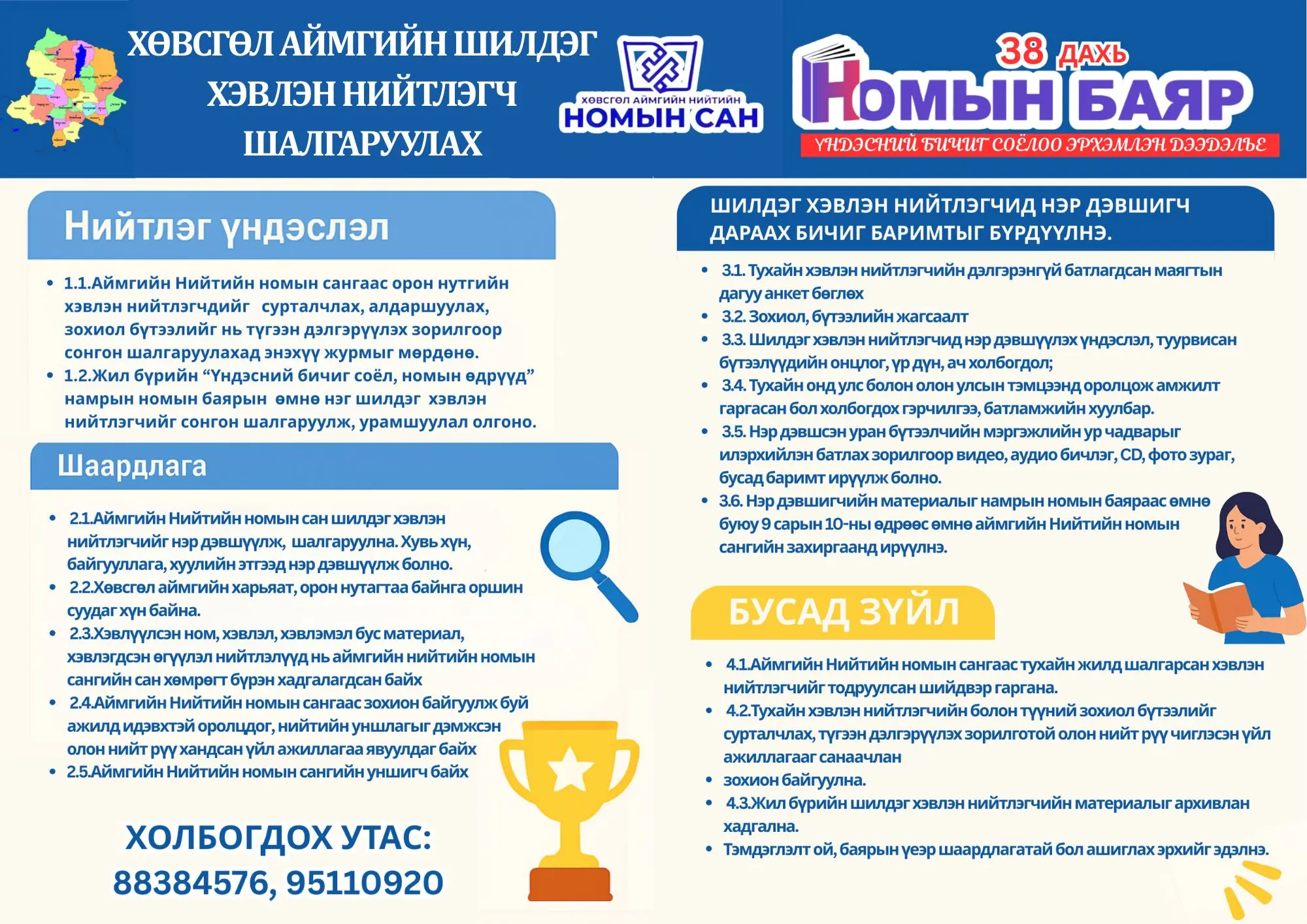 Орон нутгийн хэвлэн нийтлэгчдийг сурталчлах, алдаршуулах, зохиол бүтээлийг нь түгээн дэлгэрүүлэх зорилгоор жил бүрийн номын баярын үеэр "Шилдэг хэвлэн нийтлэгч шалгаруулах журам"-ын дагуу шалгаруулахаар болж энэ удаа Хөвсгөл аймгийн Мөрөн сумын уугуул Зохиолч Ц.Гончиг "Шилдэг хэвлэн нийтлэгч"-ээр тодорлоо. Тэрээр “Дээврээс дуслах хавар”, “Цэцгийн нэртэй сууринд”, “Цул мөнгөн гүүр”, “Тойром” гэх мэт нэртэй зохиолуудыг олны хүртээл болгосон билээ.