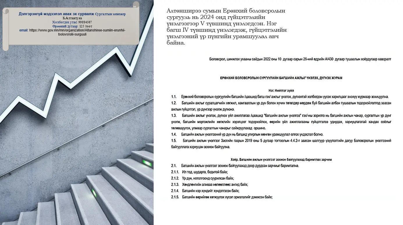 Багш ажиллагсдын үндсэн цалинг Засгийн газраас тогтоосон сүлжээ, жишгийн дагуу ажилласан жил, жилийн эцсийн үнэлгээ, ажлын үр дүнг харгалзан сургуулийн захиргаанаас хичээлийн жилийн эхэнд тогтооно.