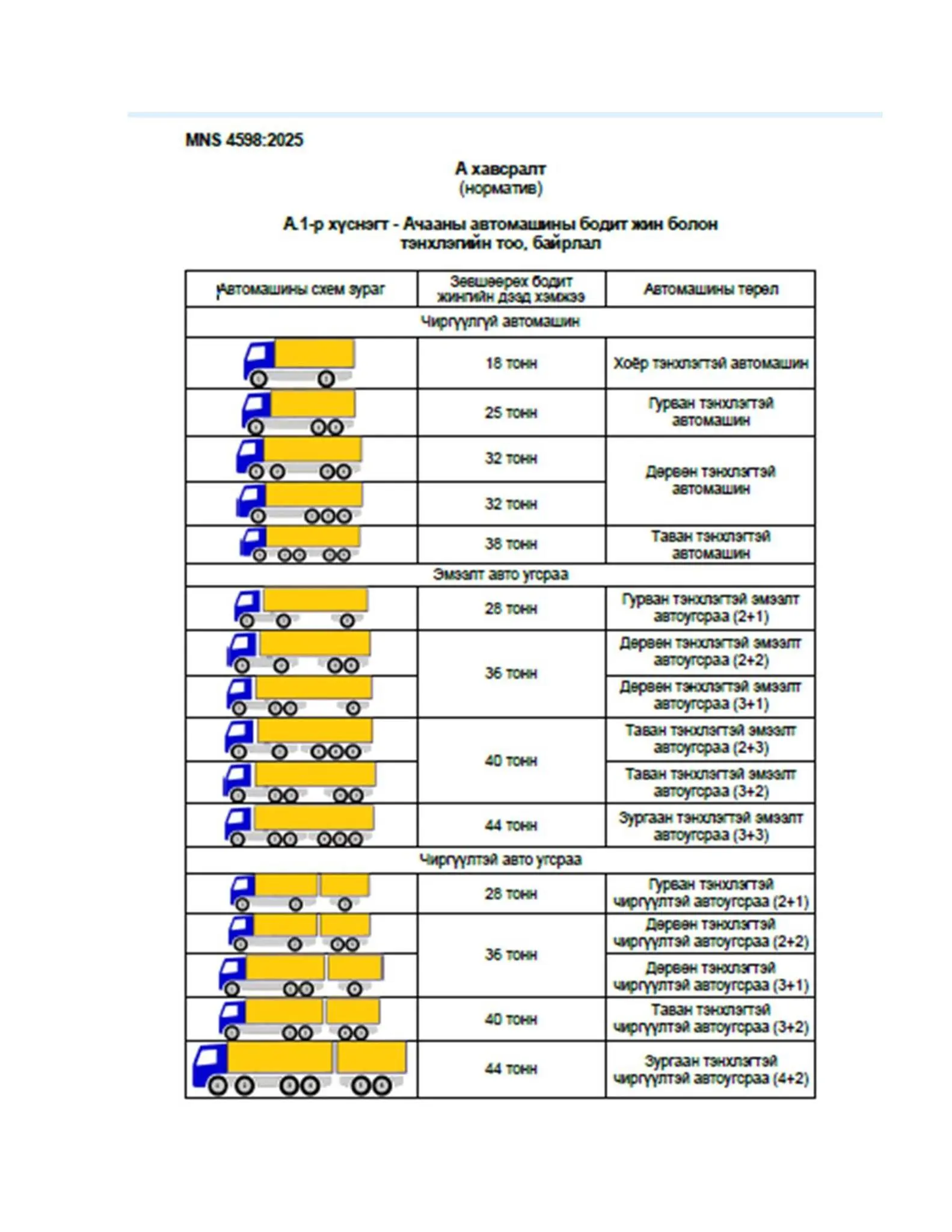 Автотээврийн хэрэгслийн ангилал. Техникийн байдалд тавих ерөнхий Шаардлага MNS 4598:2025 Ангилалтын код 43.040.01 3.2 автотээврийн хэрэгслийн бодит жин - тээврийн хэрэгслийн ашиглалтын тухайн үеийн жин. Чирүүлж яваа тээврийн хэрэгслийн жинг бодит жинд оролцуулан тооцно. https://estandard.gov.mn/.../masm/standards_details.aspx...