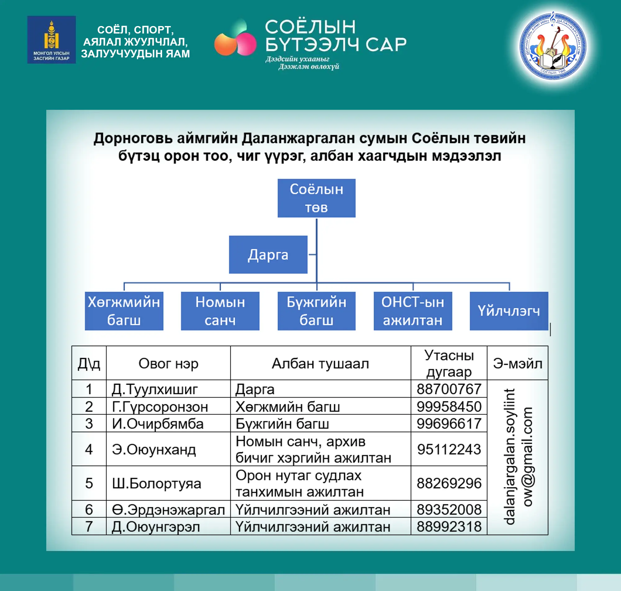 Соёлын төвийн бүтэц, орон тоо, чиг үүрэг, албан хаагчдын мэдээлэл