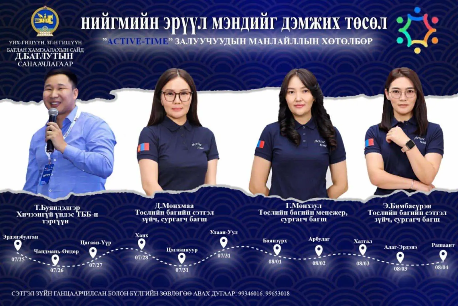 ✅ Хувь хүний хөгжил, залуусын оролцоо, манлайллыг бий болгох, сэтгэлзүйн бүлгийн болон хувьчилсан зөвлөгөө өгөх сэтгэлзүйчдийн хамтарсан баг ажиллаж, "АCTIVE TIME" хөтөлбөрт сум тус бүрээс 20 залууг хамруулж, чадавхжуулна.