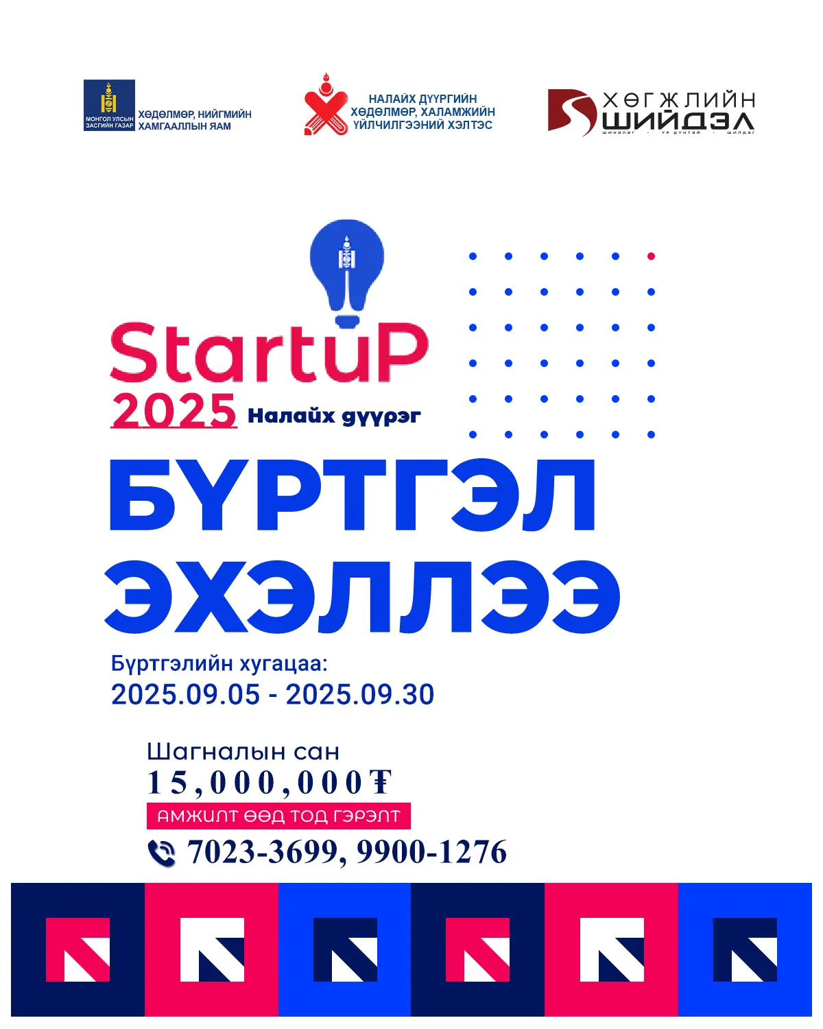 Налайх дүүргийн шинэ технологи, инновац бүхий шинэлэг санал, санаачилга гаргасан шилдэг “СтартАп” залуу, эсхүл залуучуудын 2 багийг шалгаруулж, тус бүр 15,000,000 /арван таван сая/ төгрөгийн 50% -ийг эргэн төлөх нөхцөлтэй санхүүгийн дэмжлэгийг 36 сарын хугацаанд олгоно.