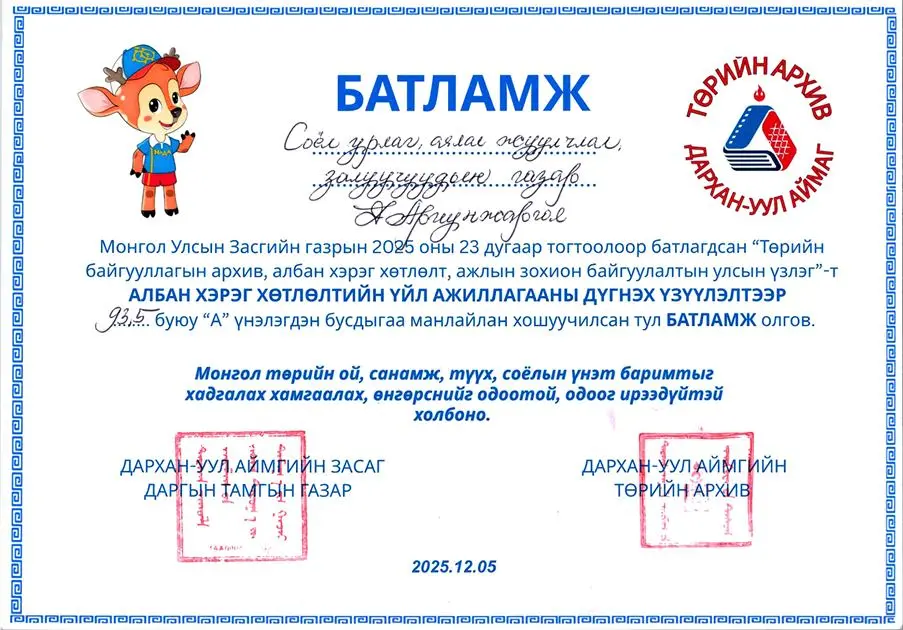 АРХИВ, АЛБАН ХЭРЭГ ХӨТЛӨЛТИЙН УЛСЫН ҮЗЛЭГТ “А” ҮНЭЛГЭЭ АВЛАА