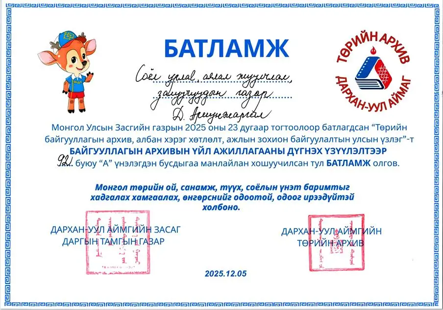Монгол Улсын Засгийн газрын 2025 оны 23 дугаар тогтоолоор зохион байгуулсан “Төрийн байгууллагын архив, албан хэрэг хөтлөлт, ажлын зохион байгуулалтын улсын үзлэг”-т Дархан-Уул аймгийн Соёл, урлаг, аялал жуулчлал, залуучуудын газар “А” үнэлгээгээр дүгнэгдлээ.