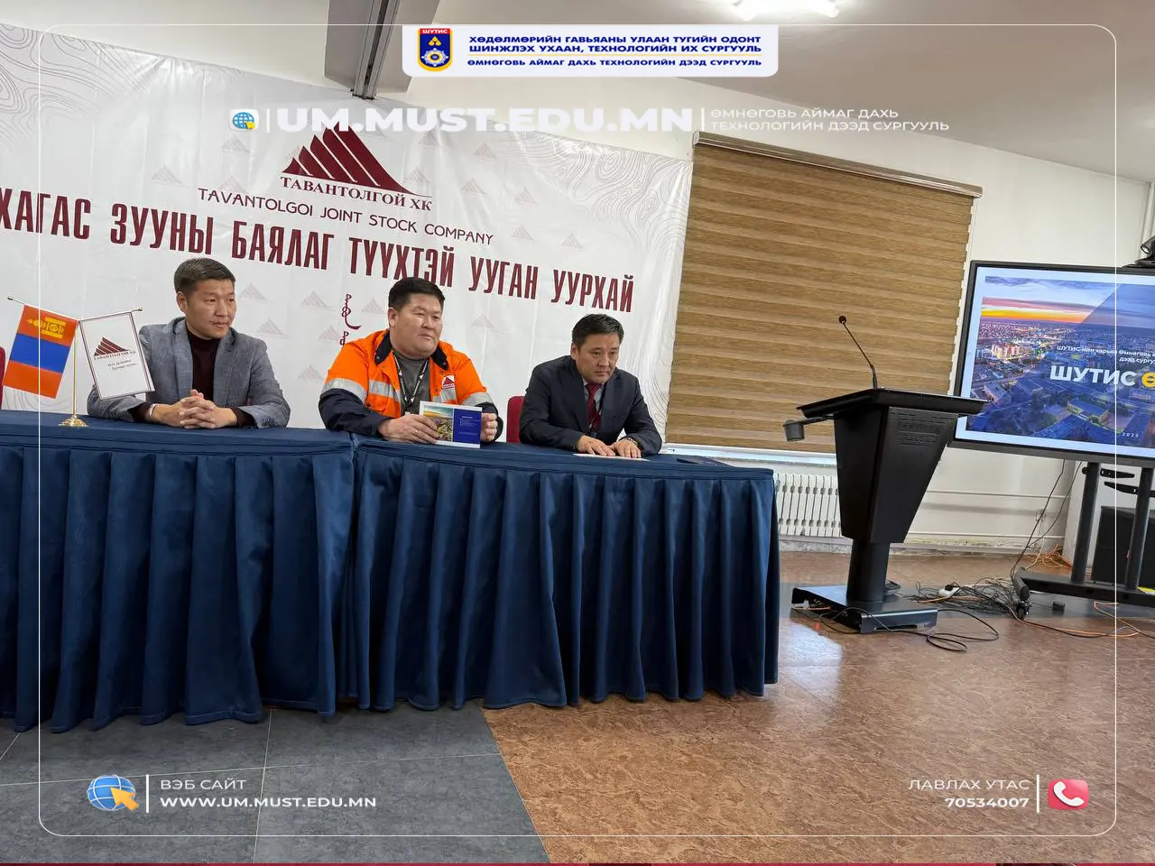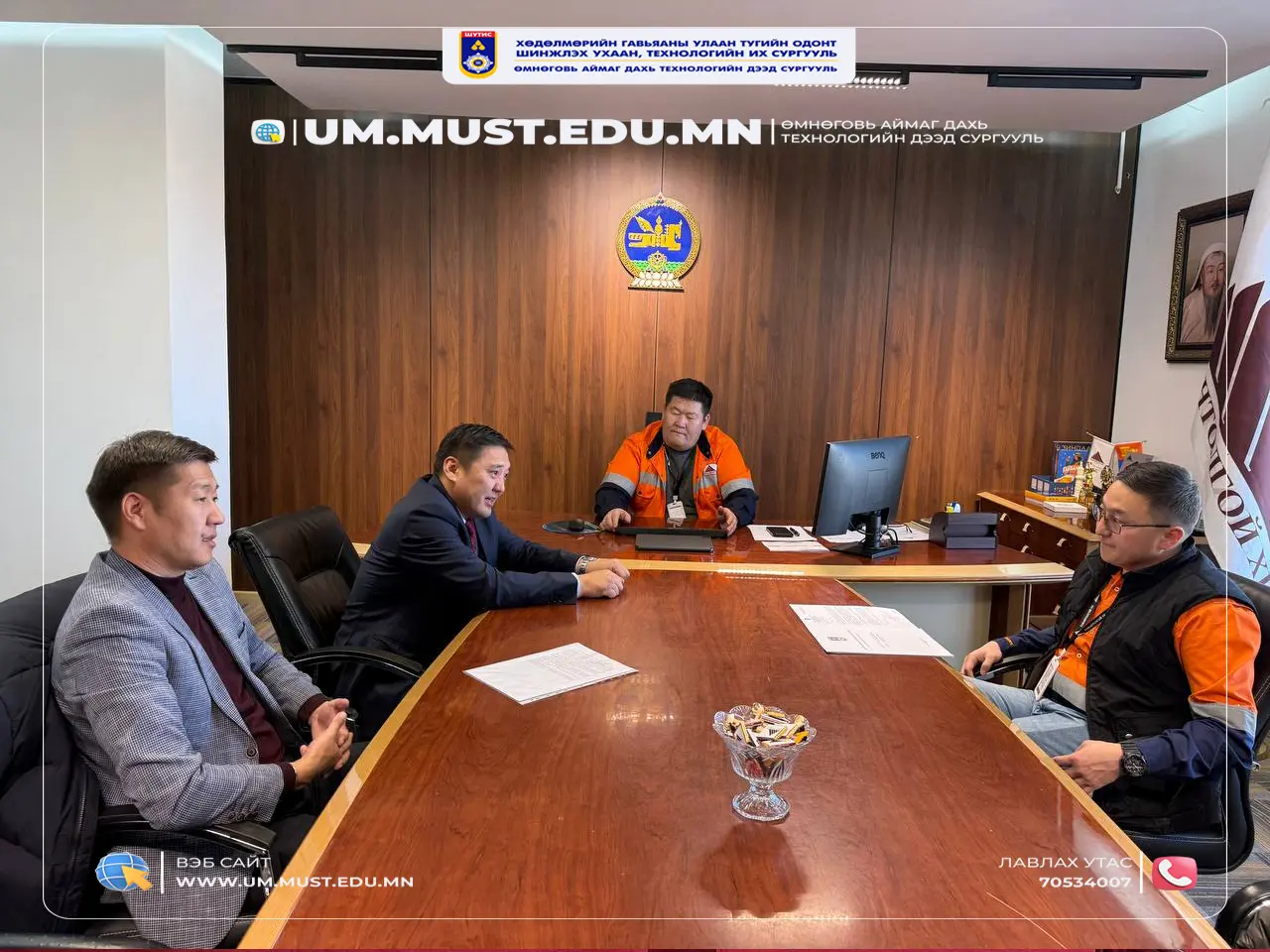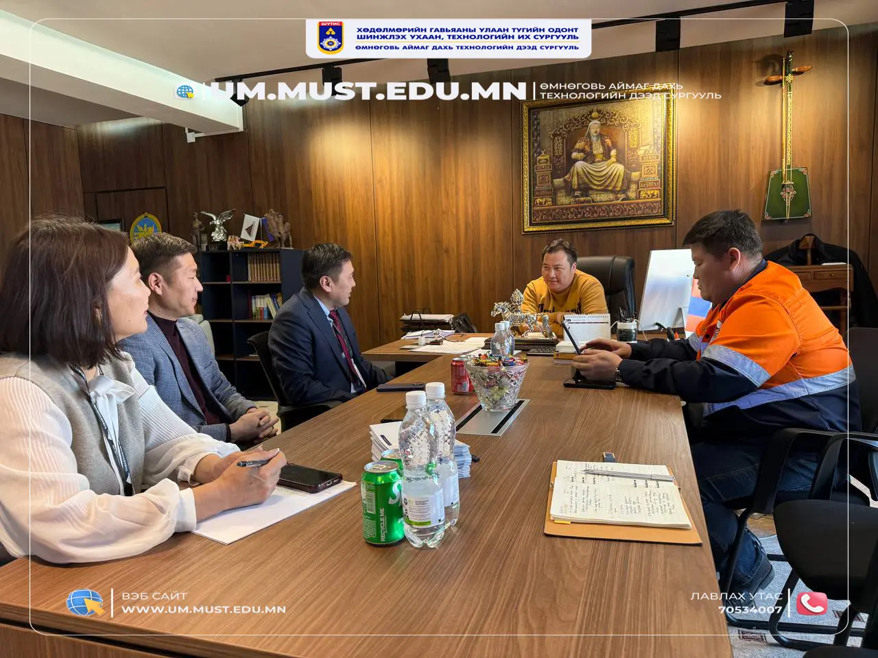 2025 оны 12-р сарын 10-ны өдөр Өмнөговь аймаг дахь Технологийн дээд сургуулийн Захирал Б.Баяржавхлан, Сургалтын албаны дарга М.Цэрэнтогтох, Эрдэм шинжилгээ түншлэл хариуцсан ажилтан Б.Түвшинжаргал, Бичиг хэргийн ажилтан Т.Ганбилэг нарын бүрэлдэхүүн “Таван толгой” ХК-ийн Гүйцэтгэх захирал Ш.Отгонбаяр, Захиргаа, удирдлагын газрын захирал С.Идэрсүрэн болон удирдлагын багтай хамтын ажиллагаа эхлүүлэх хүрээнд уулзалт зохион байгууллаа.