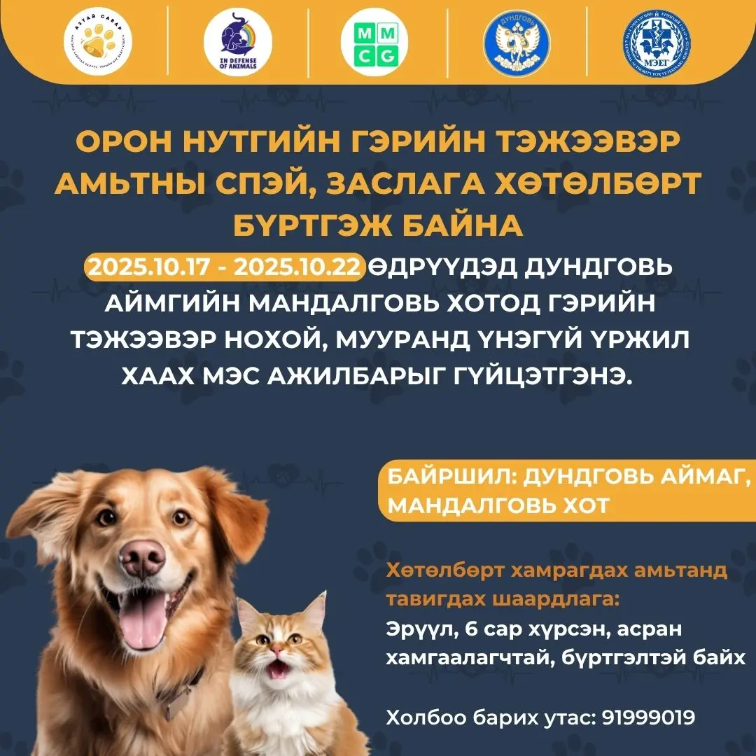 “Орон нутгийн гэрийн тэжээвэр амьтны СПЭЙ & заслага хөтөлбөр”-т одоогийн байдлаар 12 муур, 4 нохой хамрагдаад байна. Тус хөтөлбөр дуусахад 2 хоног үлдлээ. Дундговь аймагт оршин суудаг, гэрийн тэжээвэр амьтантай иргэд гэрийн тэжээвэр амьтныхаа үржлийг үнэ төлбөргүйгээр хийлгэх боломжтой тул та бүхэн өргөнөөр хамрагдан уу. Төсөв, амьтны тоо хязгаартай.