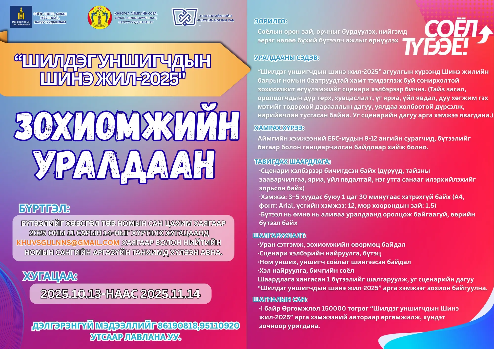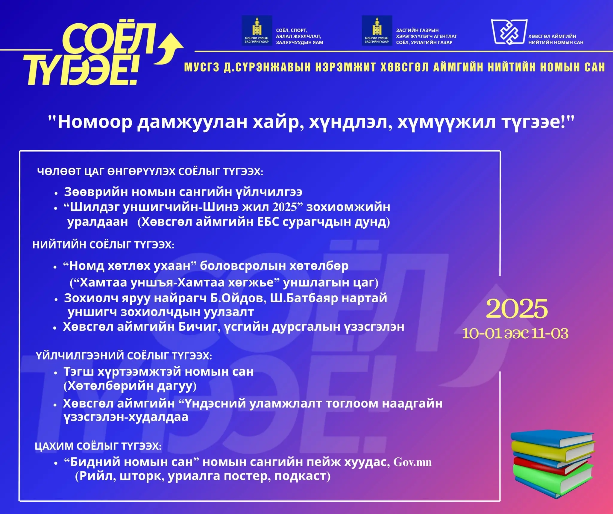 Соёлын орон зай, орчныг бүрдүүлэх соёлын үнэт зүйлсийг түгээн дэлгэрүүлэх, соёлын харилцаа болон урлагийн бүтээлийн хүртээмжийг нэмэгдүүлэх, нийгэмд эерэг нөлөө бүхий бүтээлч санаачилагыг олон нийтэд түгээх зорилго бүхий “Соёлын орон зай -бидний орчин” бүтээлч аян “СОЁЛ ТҮГЭЭЕ” уриатайгаар улсын хэмжээнд өнөөдрөөс эхэллээ.