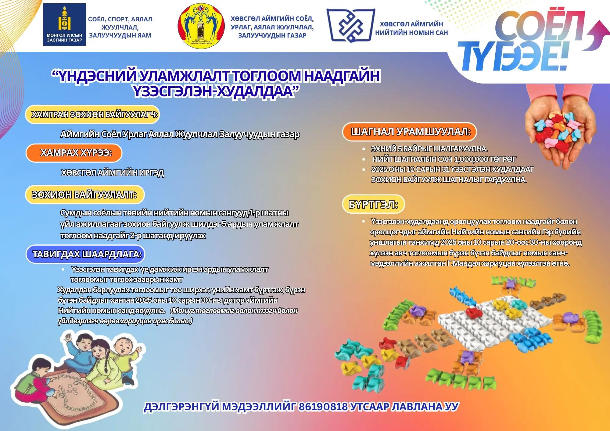 Мөн Нийслэлийн Соёл, урлагийн газар, аймгуудын Соёл, спорт аялал жуулчлал, залуучуудын газар болон Соёл, урлагийн байгууллагууд, бүх шатны төрийн байгууллагуудаас зохион байгуулж буй уралдаан, нийтийг хамарсан арга хэмжээнд идэвх санаачилгатай оролцож, хамтын оролцоогоо нэмэгдүүлэх нь ажиллаж амьдарч буй орчиндоо төдийгүй нийгэмд эерэг нөлөөлөл, соёлтой орчныг бий болгох чухал үр нөлөөтэй юм.