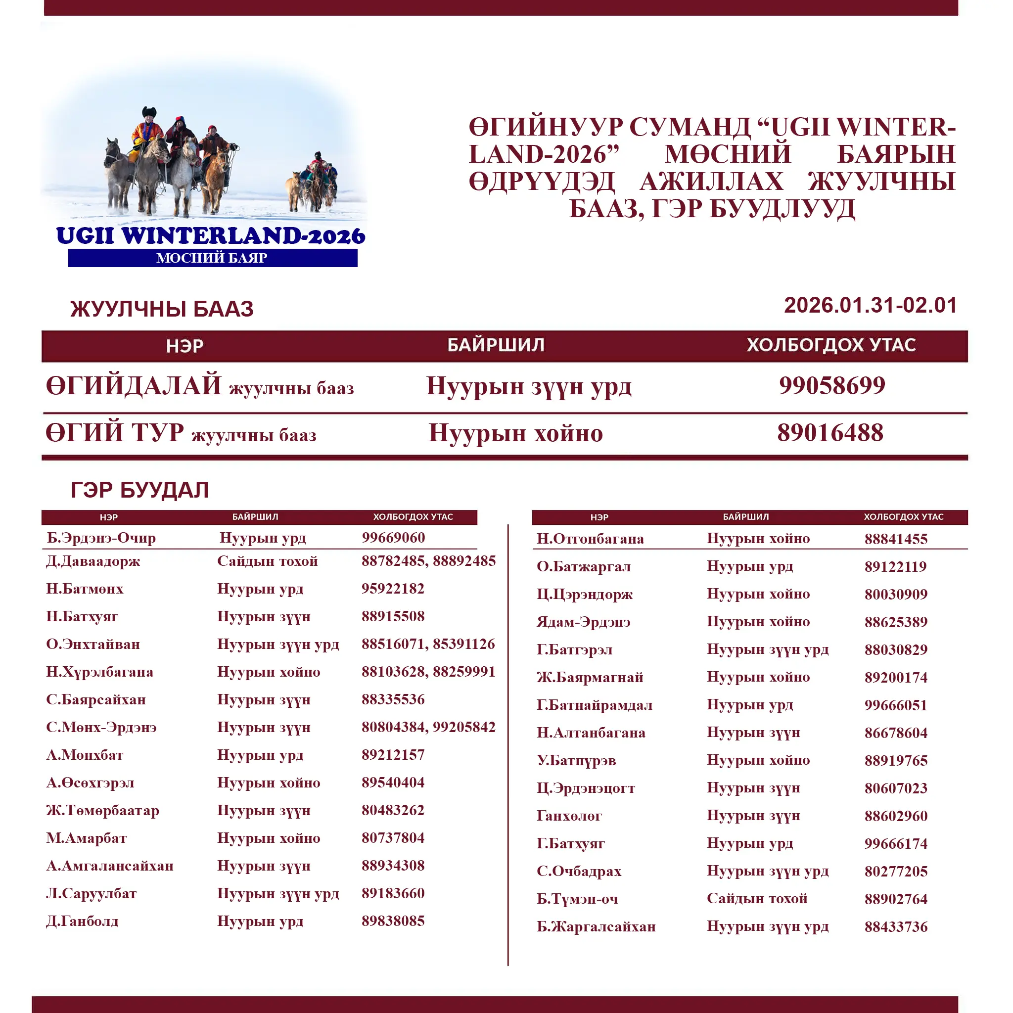 "UGII WINTERLAND-2026" мөсний баяр 2026 оны 01 сарын 31, 02 сарын 01-ний өдрүүдэд Архангай аймгийн Өгийнуур суманд Өгий нуурын зүүн ур эрэгт зохион байгуулагдана. "UGII WINTERLAND-2026" мөсний баярын хүрээнд Мөсөн шагай, Мөсөн сур, Хоккей, Адуучин, Өсвөрийн тэшүүрчдийн аймгийн аварга шалгаруулах тэмцээн зэрэг олон сонирхолтой тэмцээн уралдаан зохион байгуулагдана.