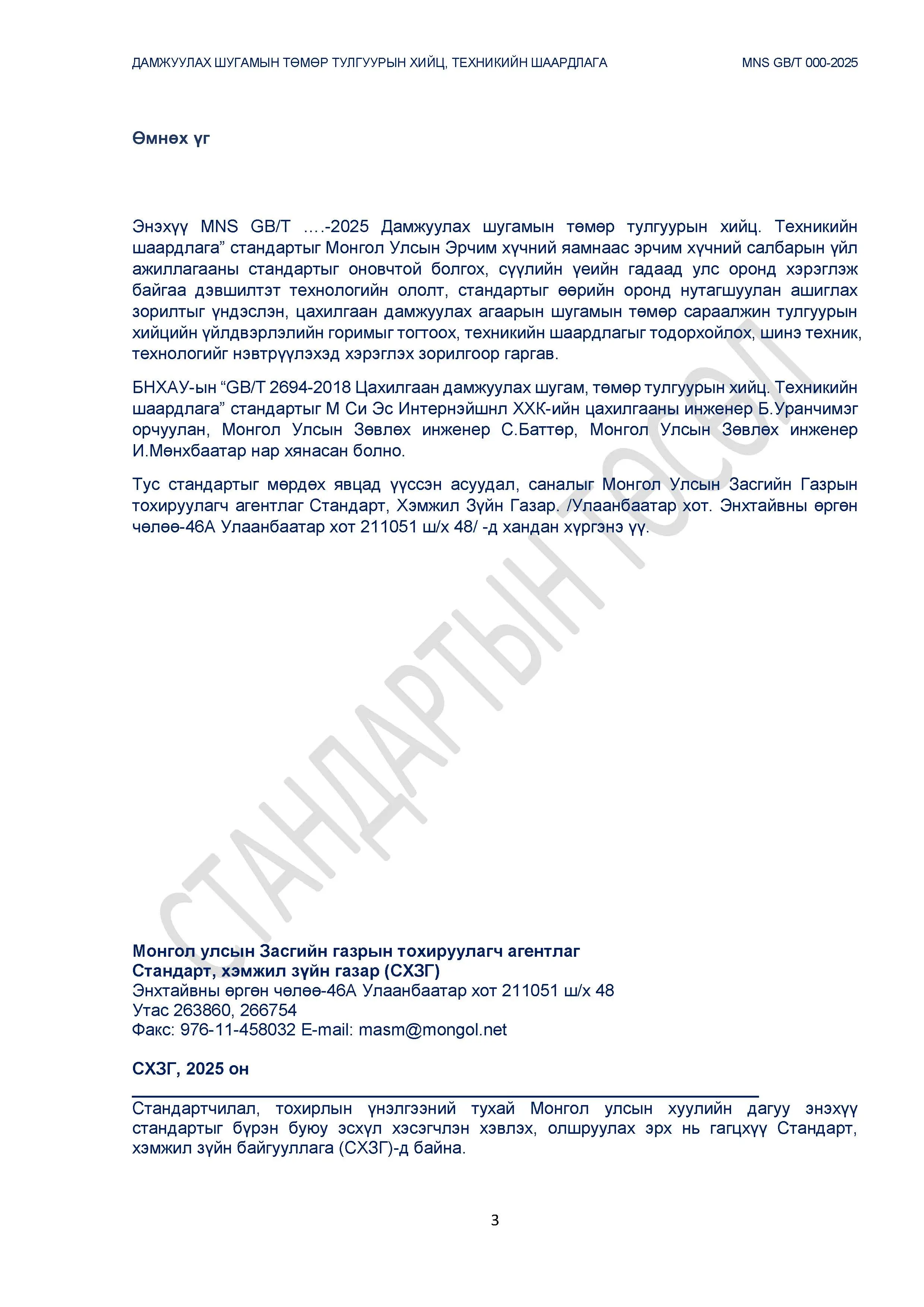 Энэ стандарт нь шинээр батлагдаж байгаа тул Эрчим хүчний стандартчиллын техникийн хороо(ТХ 11)-ноос стандартын төсөлд 2025 оны 12 дугаар сарын 29-нийг хүртэл санал авна.