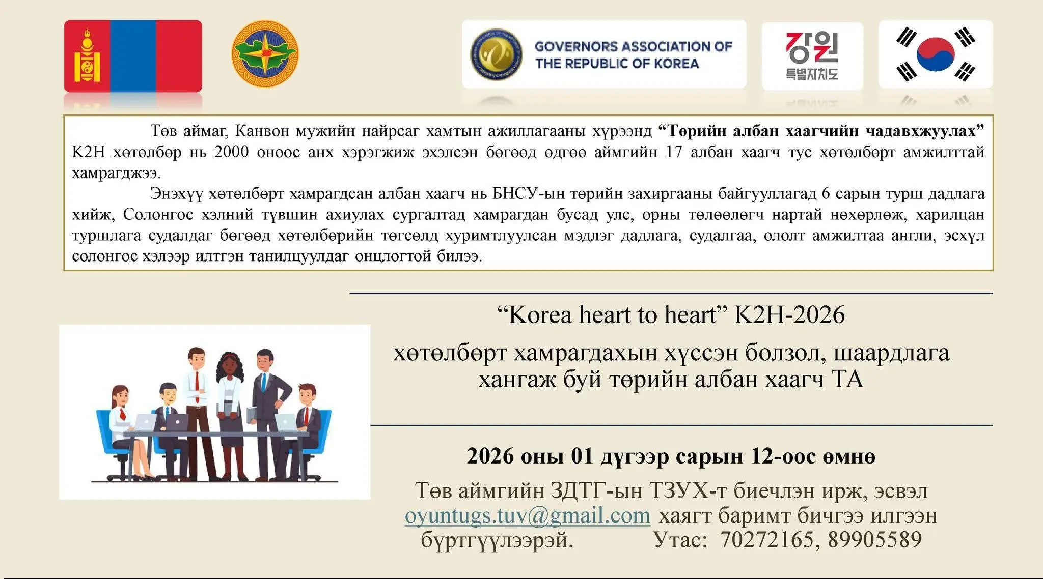Төрийн албан хаагчдын анхааралд: “KOREA HEART TO HEART”, K2H-2026 хөтөлбөр зарлагдлаа.
